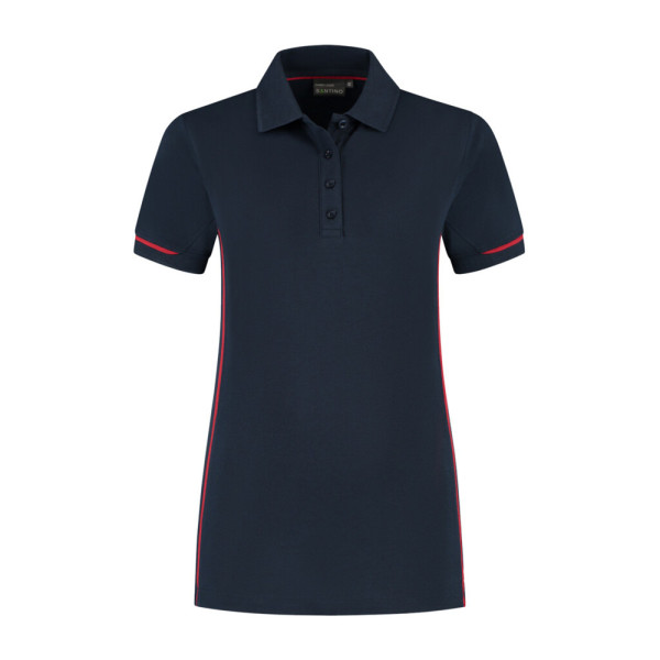 Poloshirt met contrast piping, 50% gerecycled polyester / 48% organisch katoen / 2% elastan (GRS gecertificeerd), 210 gr/m2, piqué, ladies fit, korte mouw met 1x1 ribboord en contrast piping, plat gebreide kraag met 4 knoopsluiting, 3D logo transfer op onderzijde.