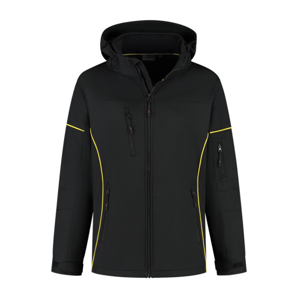 Softshell met contrast piping, 94% gerecycled polyester / 6% elastan (GRS gecertificeerd) , 310 gr/m², 3-laags softshell met microfleece als binnenlaag, unisex, stretch regular fit met opstaande kraag en afritsbare capuchon, voorsluiting met windvanger YKK rits met puller, 2 steekzakken, borstzak en mouwzak met YKK rits en puller, gevoerde mouwen met verstelbare manchetten en windstoppers. Winddicht, ademend, waterafstotend en onderzijde verstelbaar middels koord met stopper, 3D logo transfer op onderzijde.