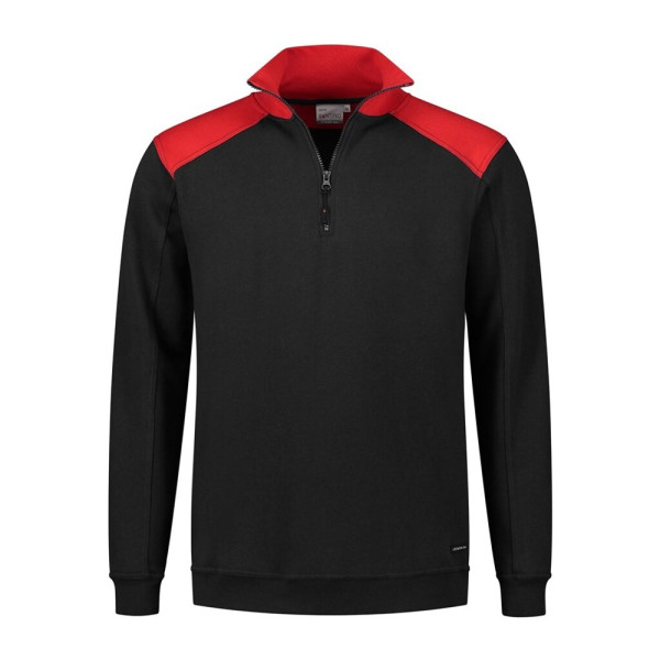 Zipsweater, 50% katoen / 50% polyester, 280 gr/m², french terry met geruwde binnenzijde, regular fit met opstaande kraag met korte YKK rits, mouw met ribmanchet tailleband in 1x1 rib, kraag en schouderstuk in contrast kleur.