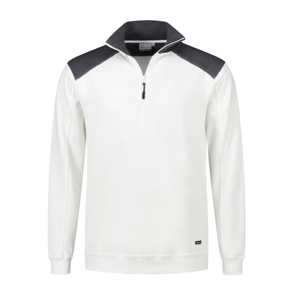 Zipsweater, 50% katoen / 50% polyester, 280 gr/m², french terry met geruwde binnenzijde, regular fit met opstaande kraag met korte YKK rits, mouw met ribmanchet tailleband in 1x1 rib, kraag en schouderstuk in contrast kleur.
