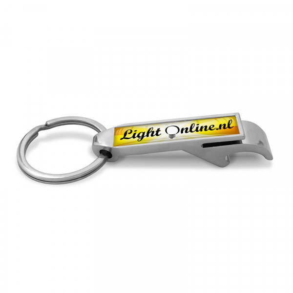 Zilveren sleutelhanger met flessenopener eraan. Op het vlakke stuk op de hanger kan een dominglabell bevestigd worden met een formaat van 42,3 x 9,3 mm. Een populair relatiegeschenk omdat het vaak onder de aandacht komt bij mensen!