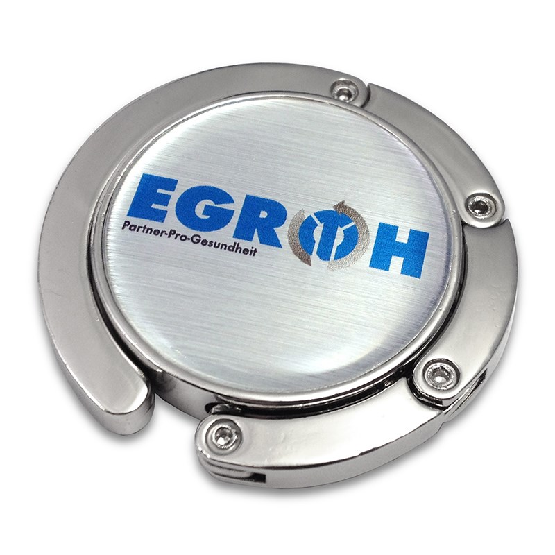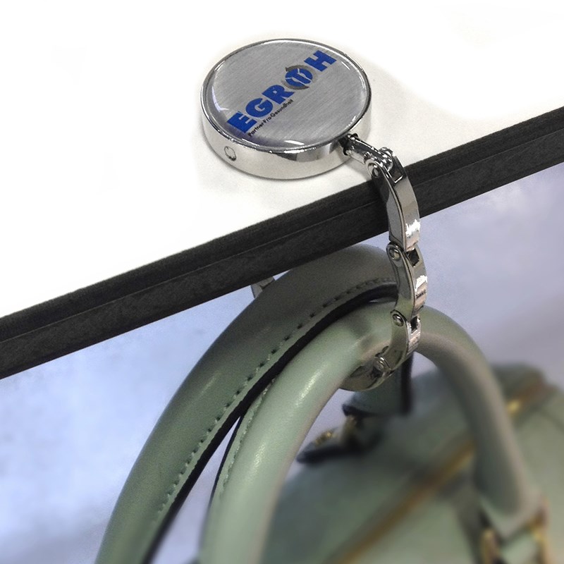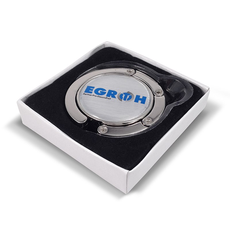 Functionele hanger om je tas of jas op te hangen. Ingeklapt heeft de hanger een compacte ronde vorm, maar klap je het uit, dan ontstaat er een 'haak' om je tas of jas aan op te hangen. Het ronde deel laat je rusten op je bureau of plank. Zo rust je tas nooit meer op de grond. De hanger is voorzien van een fraai dominglabel van Ø 32 mm waarop je je logo kunt laten zetten of reclameboodschap. Het geheel is verpakt in een luxe verpakking van een wit kartonnen doosje met zwarte velours vulling. Een exclusief geschenk om te geven.