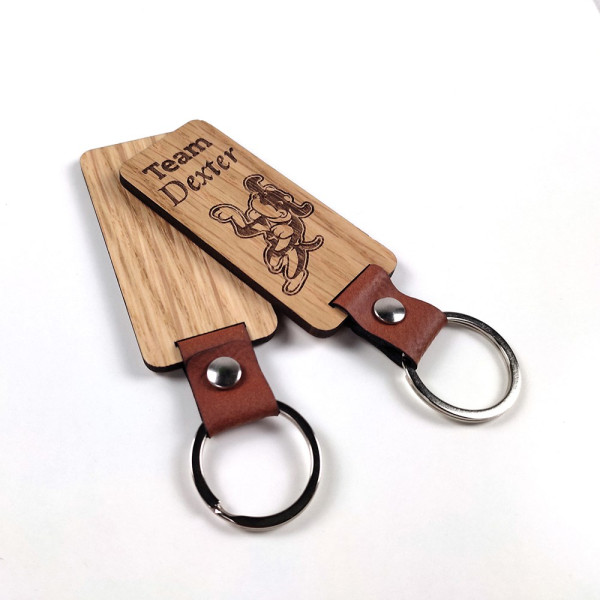 Duurzaam en trendy. Deze sleutelhangers van hout met een leuk accent van een leren tussenstuk, kunnen in bijna iedere vorm gesneden worden die je maar wilt. Wat past bij jouw huisstijl of campagne? De hangers kunnen superstrak worden gegraveerd met laserprecisie of voorzien van een scherpe full colour-bedrukking. Keuze uit verschillende houtsoorten: Esdoorn, Eiken, Bamboe, Kers of Walnoot en ook de leersoorten zijn in diverse uitvoeringen. Deze sleutelhangers passen helemaal in de trend van het gebruiken van duurzame producten en eco-uitstraling. Leef je uit! Vraag naar de mogelijkheden.