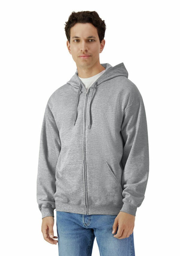 Gildan Softstyle Midweight Unisex Zip Sweater met capuchon, buidelzak en metalen rits. Met een geborstelde binnenkant met een 100% katoenen buitenkant, ideaal voor DTG-printen. Ook verkrijgbaar in een ronde hals en hoodie uitvoering