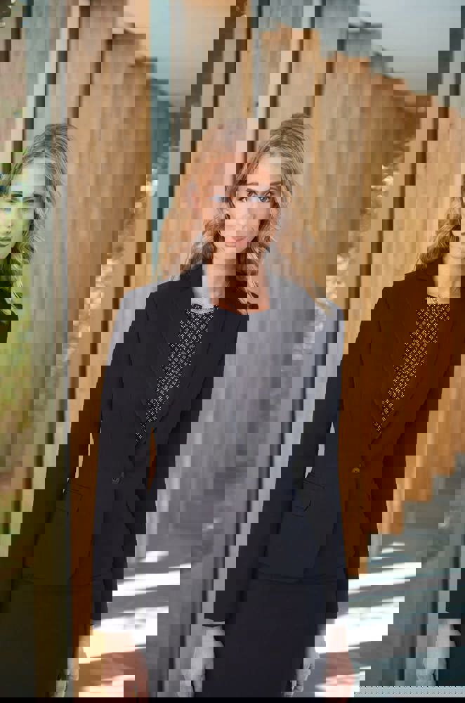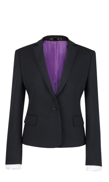 Korte damesblazer. 1 knoop. Getailleerde snit. Revers met sierstiksels. Split aan de achterkant.