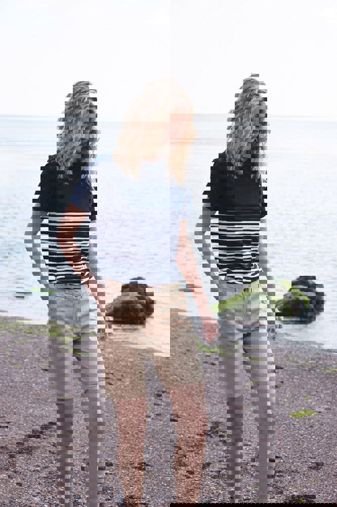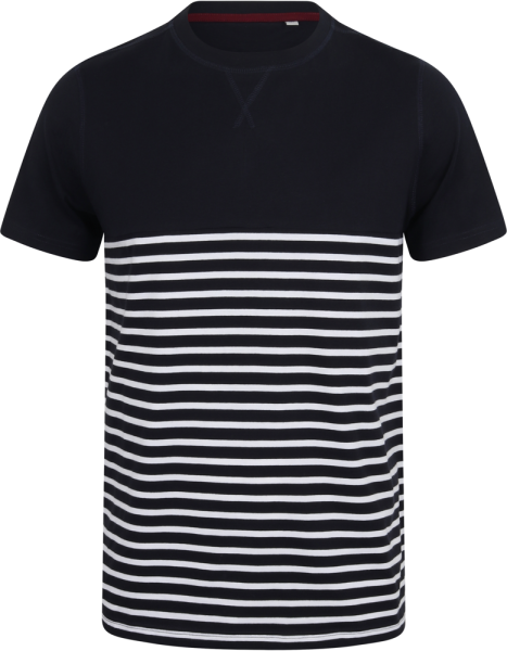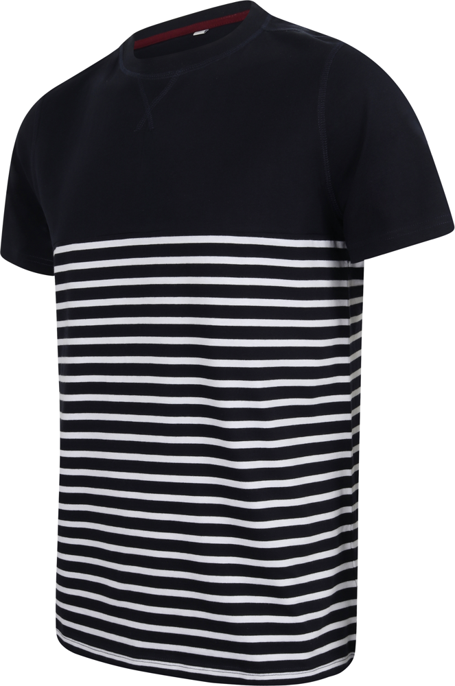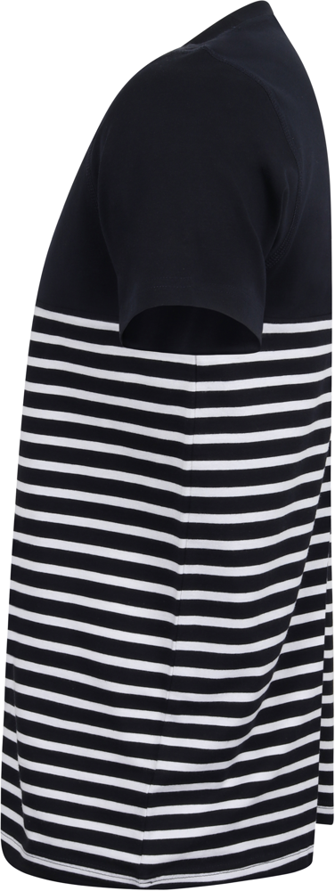 100% katoen jersey. Dikker t-shirt met korte mouwen. Klassieke snit. No label. Ronde hals met stretch geribde hals. Dubbelgestikt bij manchetten en zoom. V-flatlockstiksels aan de hals. Met flatlocknaden bij hals, schoudernaden en armgaten. Hoge naad op de borstzoom. Onderaan gestreept. Contrasterende effen bovenkant en mouwen.