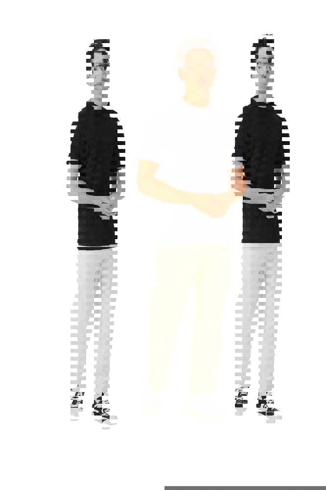 100% katoen (behalve Graphite Heather: 50% katoen / 50% polyester en Sport Grey: 90% katoen / 10% polyester). 150 g/m². Ribbelkraag met smalle boord. Schouderband voor meer comfort en duurzaamheid. Klassieke snit.