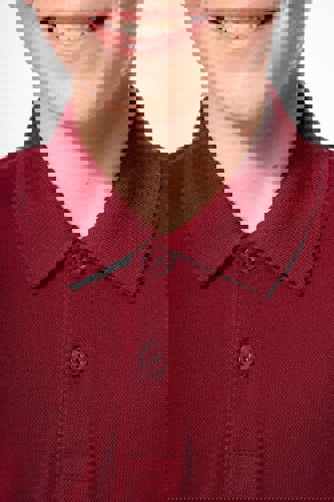 100% biologisch katoen. Gekamd katoen en piquétricot. Enzymgewassen. Rechte snit. 1x1 ribboord aan hals en mouwuiteinden. Knooplijst met twee bijpassende knopen. Bijpassende nektape in de hoofdstof in de kraag. Verstevigde schouders. Zijsplitten. Boord onderaan afgewerkt met dubbel stiksel. Geen merklabel, enkel een afscheurbaar maatlabel voor eenvoudige personalisatie.