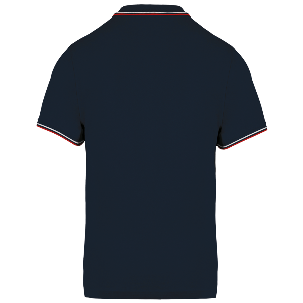 100% katoen piqué. Knooplijst met 3 knopen. Nektape en zijsplitjes in contrastkleur. Afwerking in rib met gecontrasteerde rand aan de kraag en mouwuiteinden. Afgewerkt met dubbele stiksels onderaan.