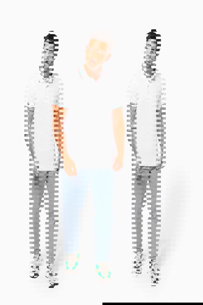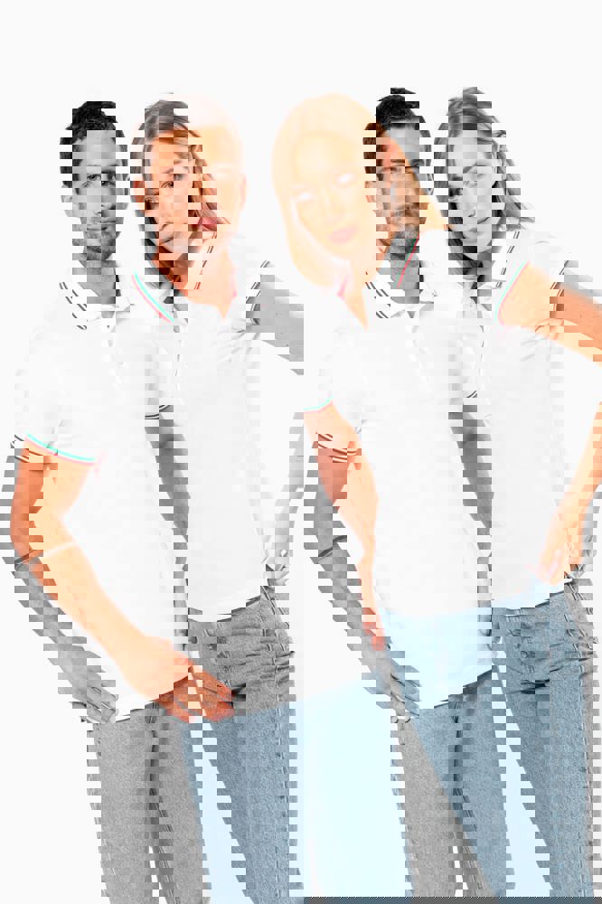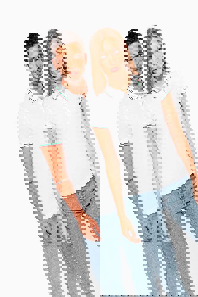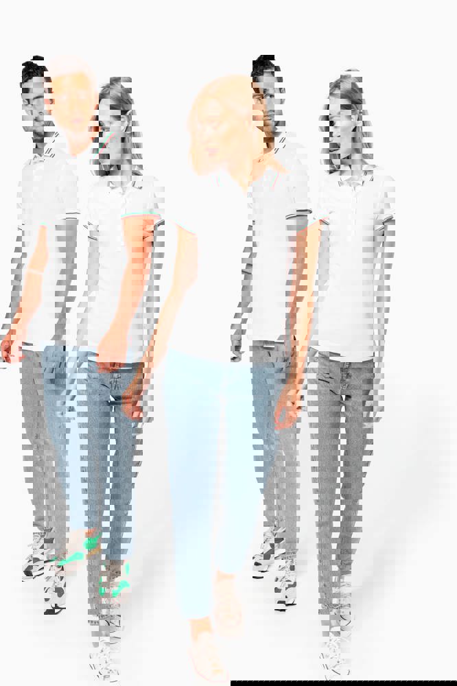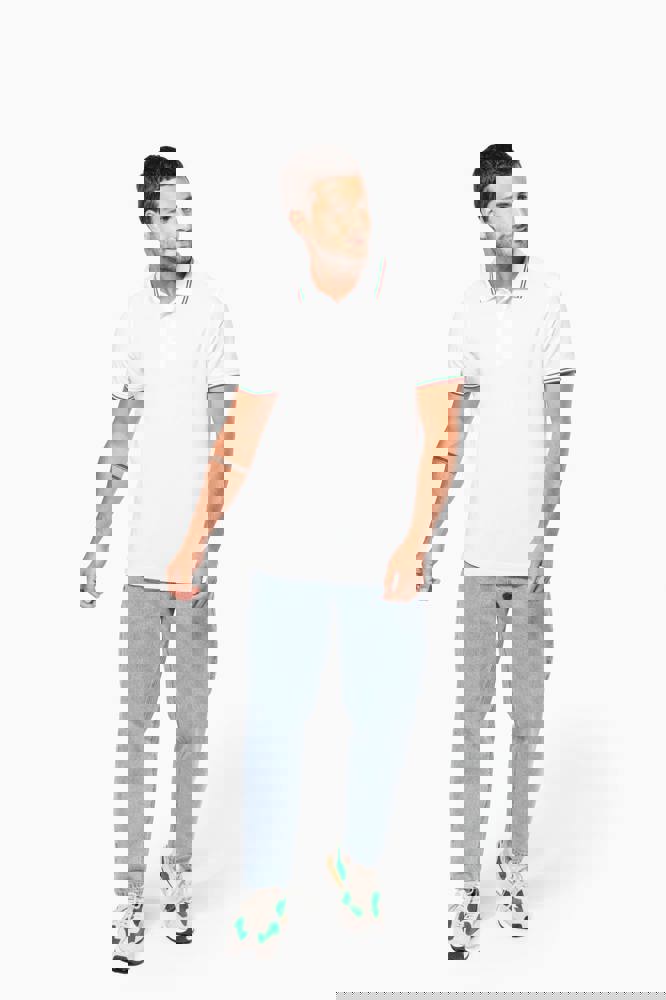 100% katoen piqué. Knooplijst met 3 knopen. Nektape en zijsplitjes in contrastkleur. Afwerking in rib met gecontrasteerde rand aan de kraag en mouwuiteinden. Afgewerkt met dubbele stiksels onderaan.