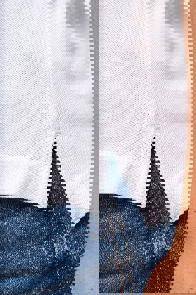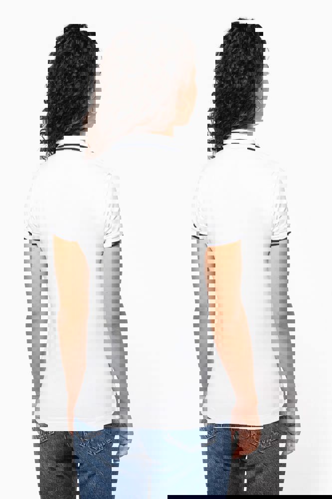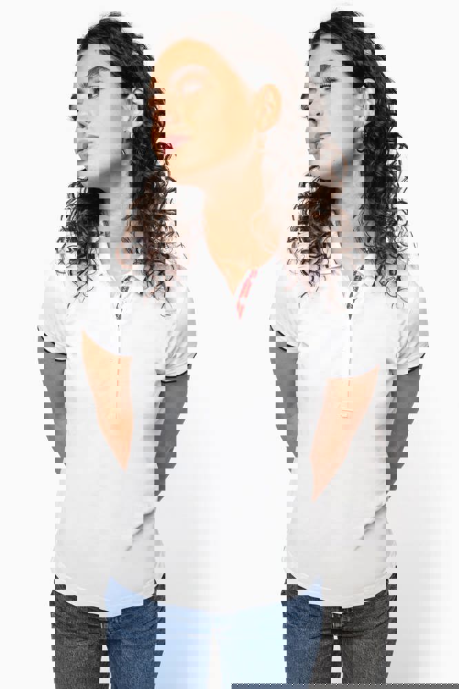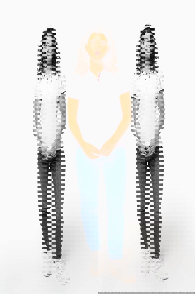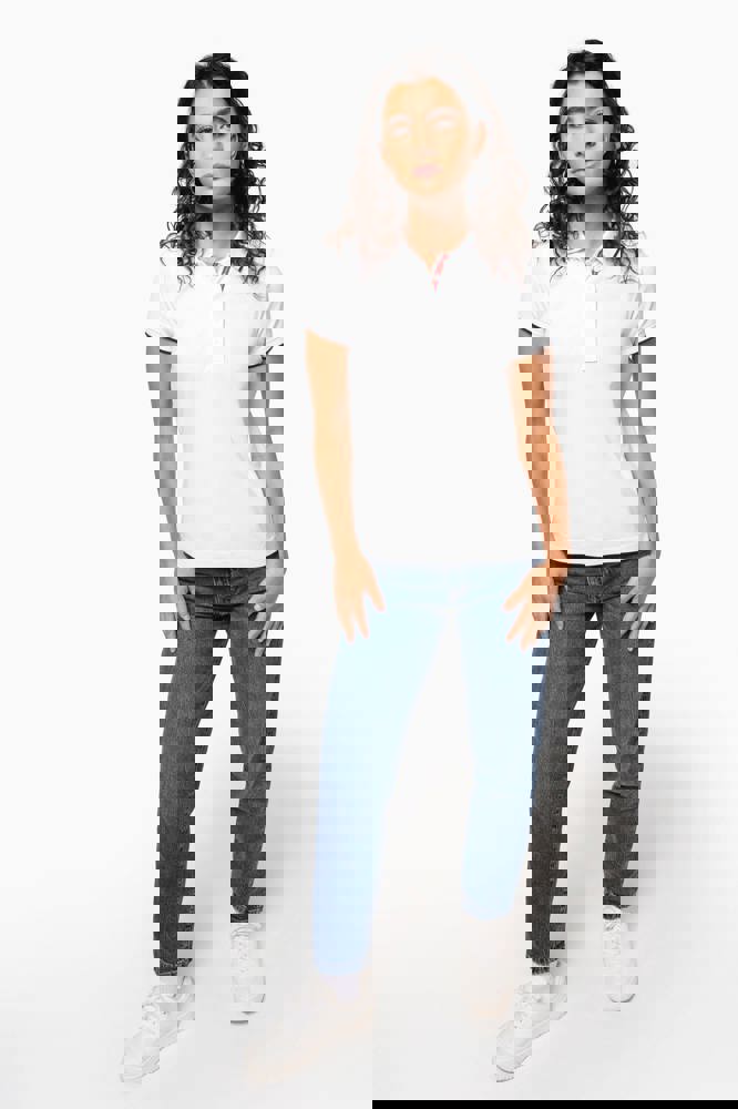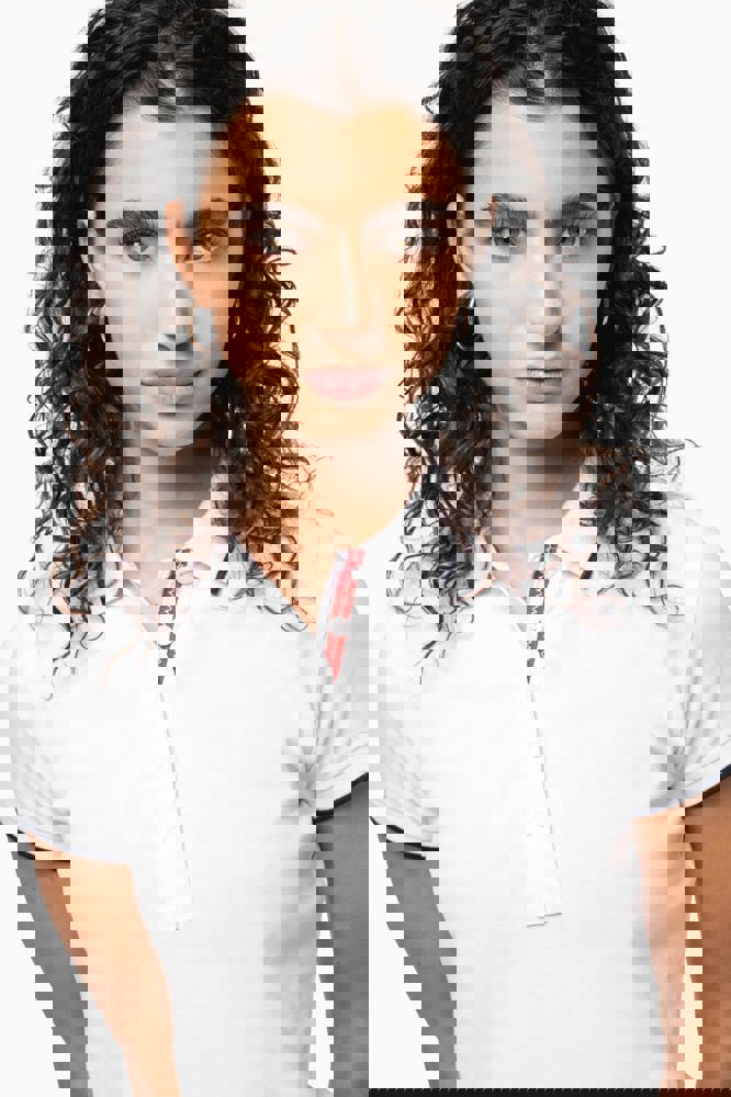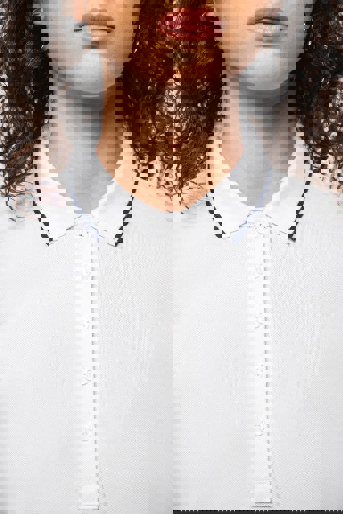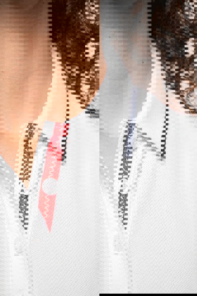 100% katoen piqué. Kraag in rib met bies in contrastkleur aan de boven- en onderkant (behalve White/ Navy : geen contrast onder de kraag, alleen een dunne rode rand onder de sluiting). Nektape en zijsplitjes in contrastkleur. Fantasie knooplijst met 5 knopen. Mouwuiteinden in rib met bies in contrastkleur. Afwerking met dubbele stiksels aan de onderkant. De kraag is verstevigd aan de achterkant en kan omhoog of omlaag gedragen worden.