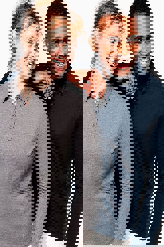 100% katoen (Heather Grey: 65% katoen / 35% polyester - Oxford Grey : 90% katoen / 10% viscose). Katoenen, gekamde jersey. Hemdskraag. Knooplijst met 3 metalen knopen. Inzetstuk op de schouder. Mouwuiteinden in ribboord. Dubbel stiksel aan de onderkant.