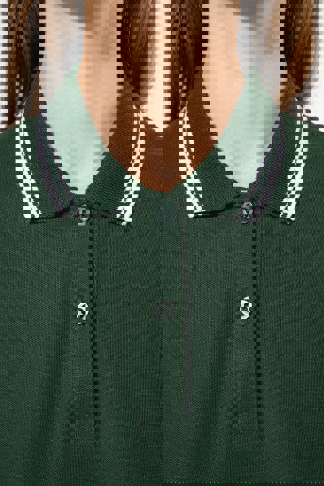 100% gekamd katoen. Voor de gevlamde kleuren: 92% katoen / 8% viscose. Piquétricot. Rechte snit. Knooplijst met 2 toon-op-toon knopen aan de kraag. Nektape in de hoofdstof in de kraag. Zijsplitten met een afwerkingsboord in de hoofdstof. Ribboord met contrasterende biesjes aan kraag en mouwuiteinden. Dubbel stiksel aan de onderkant.