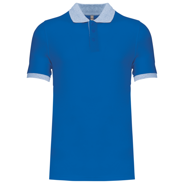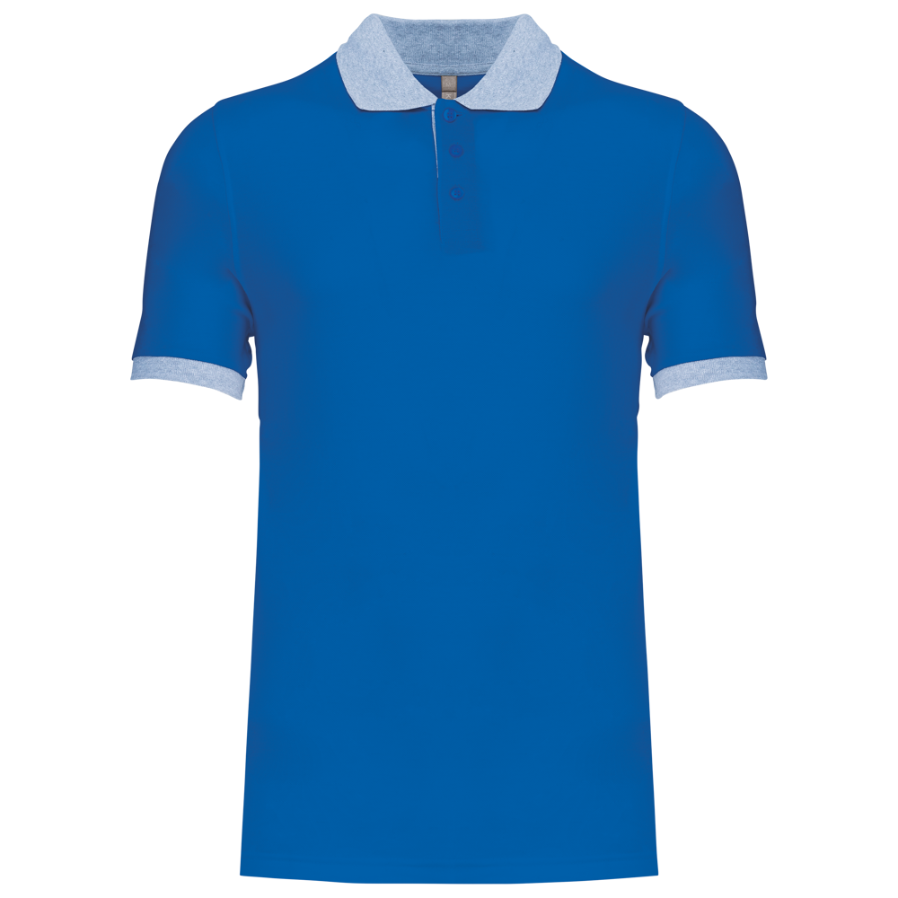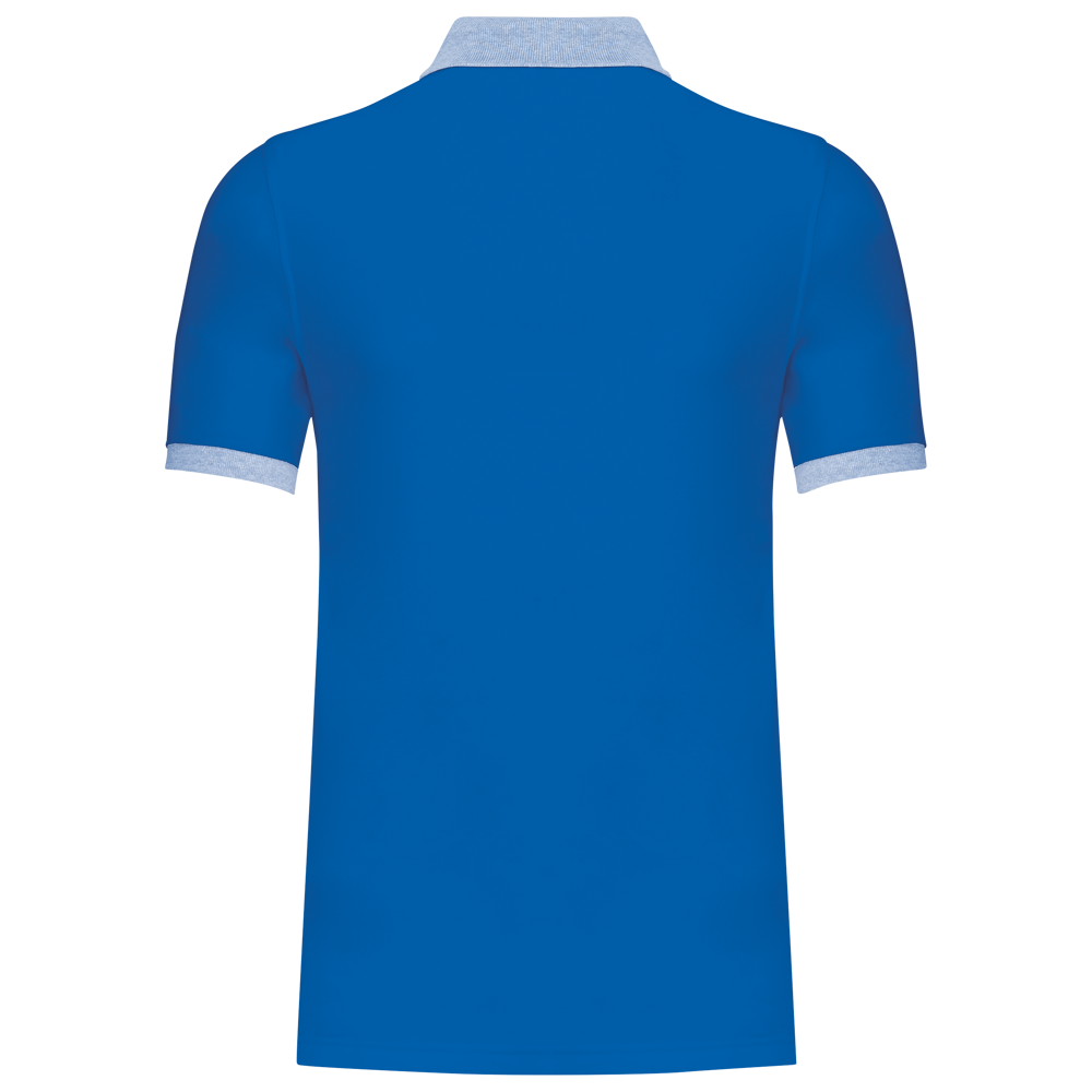 100% voorgekrompen katoen piqué (Oxford Grey: 90% katoen / 10% viscose). Contrasterende ribboord aan de kraag en mouwuiteinden. Contrasterende nektape. Aan de binnenzijde een contrasterende knooplijst met 3 knopen. Afwerking met dubbel stiksel onderaan.