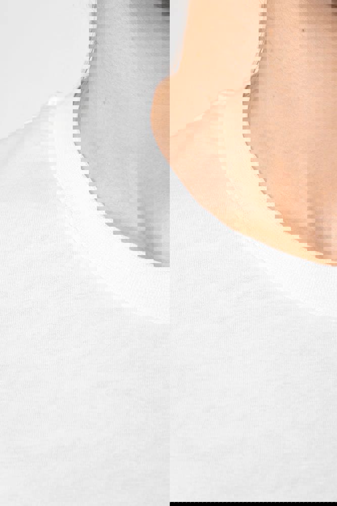 100% katoen. Gekamd katoen. Jersey. Rechte snit. Cut-and-sew-techniek. Ronde hals met toon-op-toon nektape. Versteviging van de schoudernaad met een silicone bandje. De mouwuiteinden en onderkant zijn afgewerkt met een zoom met dubbel stiksel. Geen merklabel, maar enkel een Tear Away-maatlabel voor eenvoudige personalisatie. Gemaakt in Portugal.