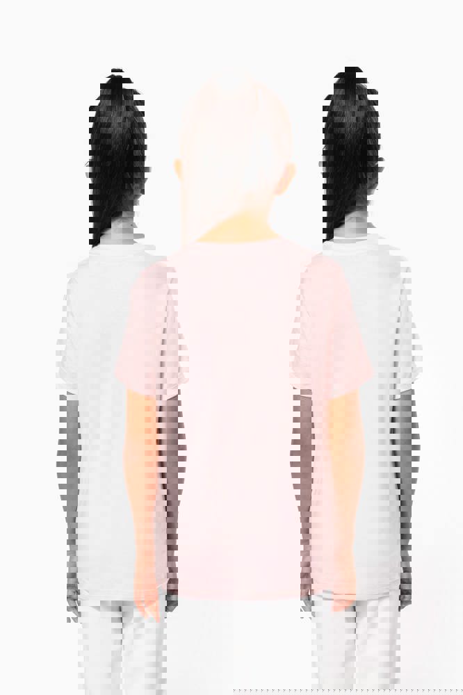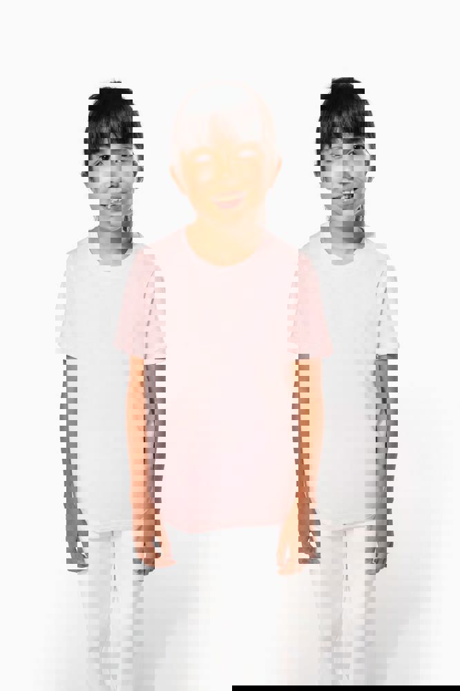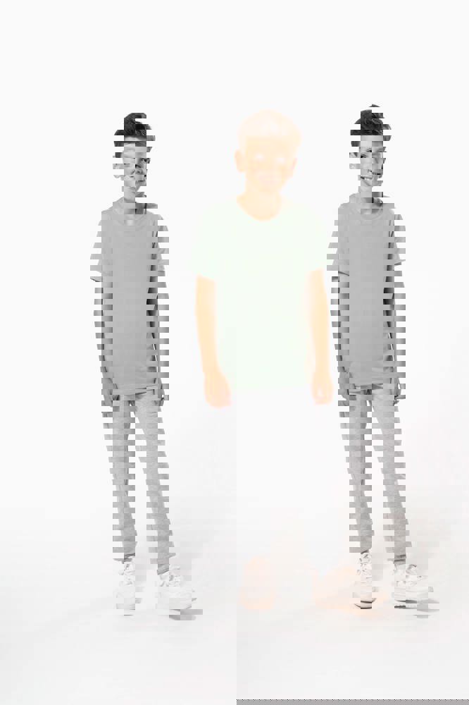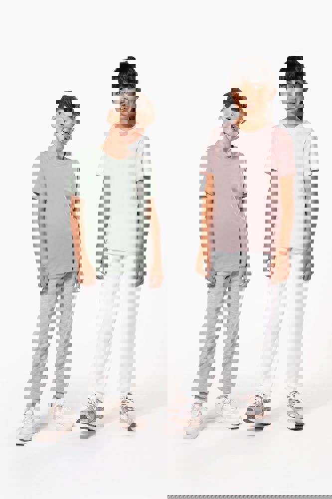 Effen kleuren : 100% katoen. Kleur Ash Heather 98% katoen / 2% viscose en Oxford Grey : 90% katoen / 10% viscose. Alle kleuren zijn gemaakt van biologisch katoen in omschakeling. Gekamd katoen. Cut-and-sew-techniek. Ronde hals in ribboord en elasthan. Toon-op-toon nektape. Dubbel stiksel aan mouwuiteinden en onderkant.