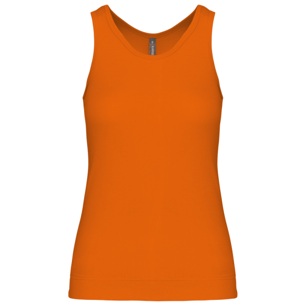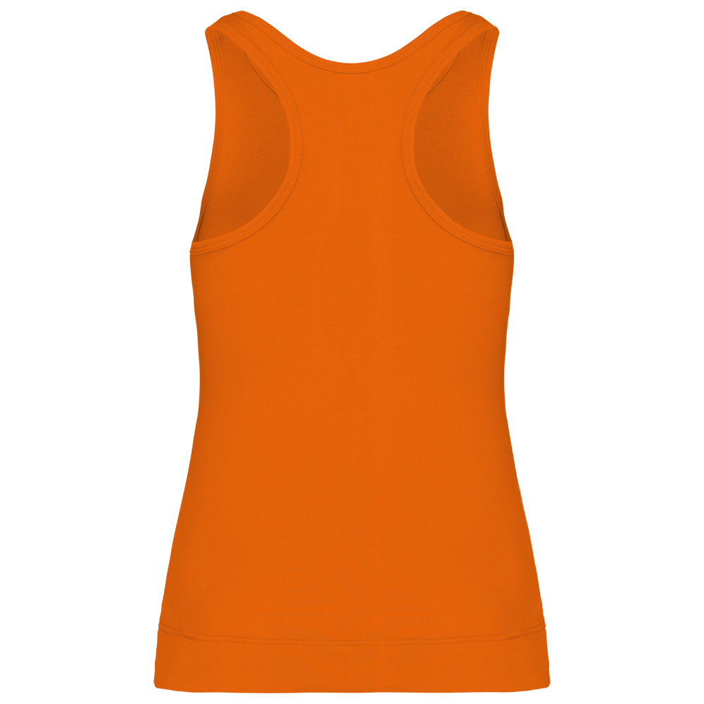 100% katoen 1x1 rib. Racerback. Afwerking met dubbele stiksels.