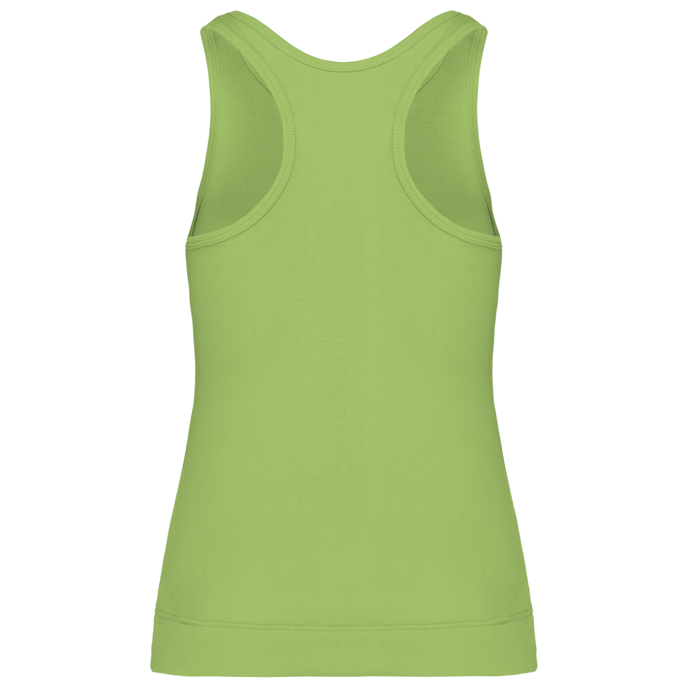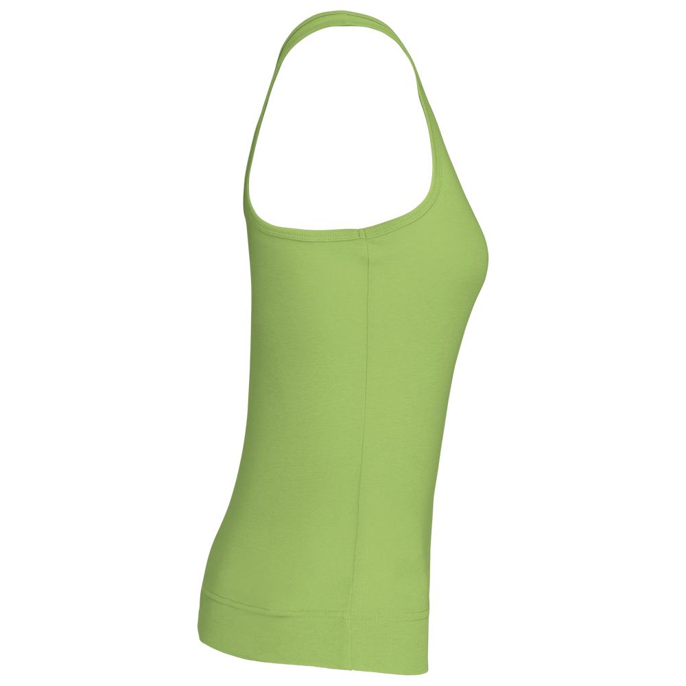 100% katoen 1x1 rib. Racerback. Afwerking met dubbele stiksels.