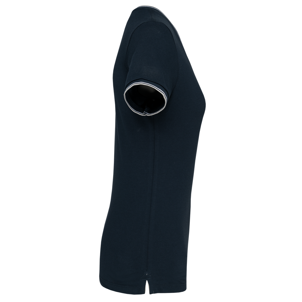 100% gekamd katoen piqué (Oxford Grey: 90% katoen / 10% viscose). Ribboord met contrasterende strepen aan de kraag en mouwuiteinden. Contrasterende zijsplitten en nektape in de kraag. Afwerking met dubbel stiksel onderaan.