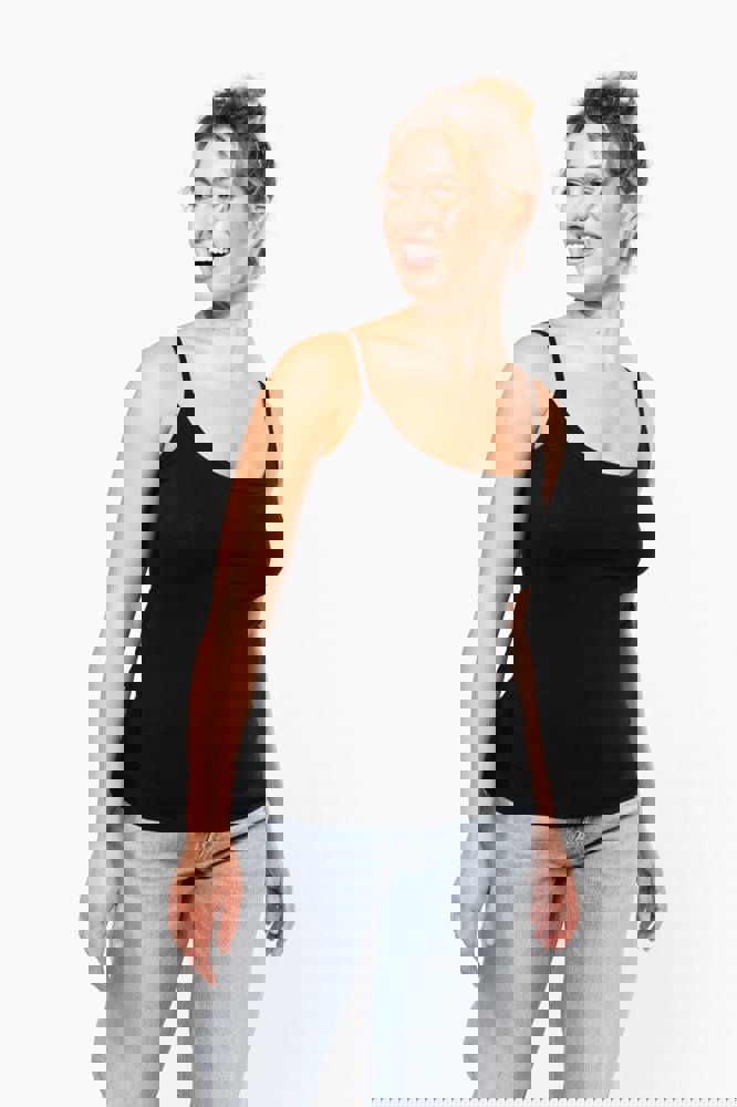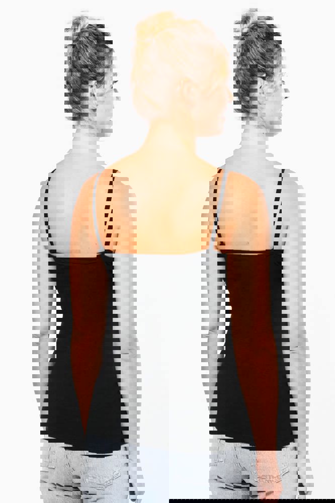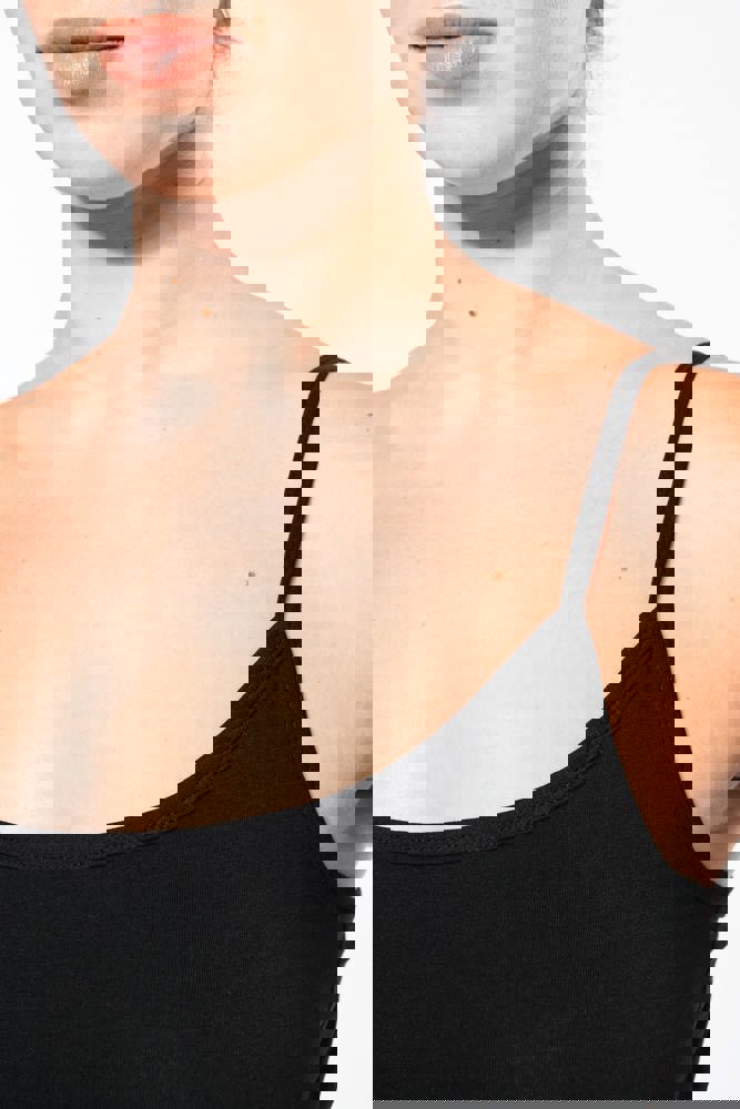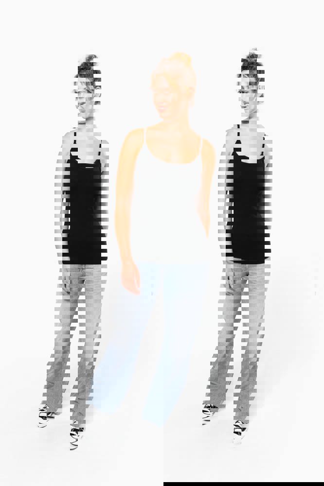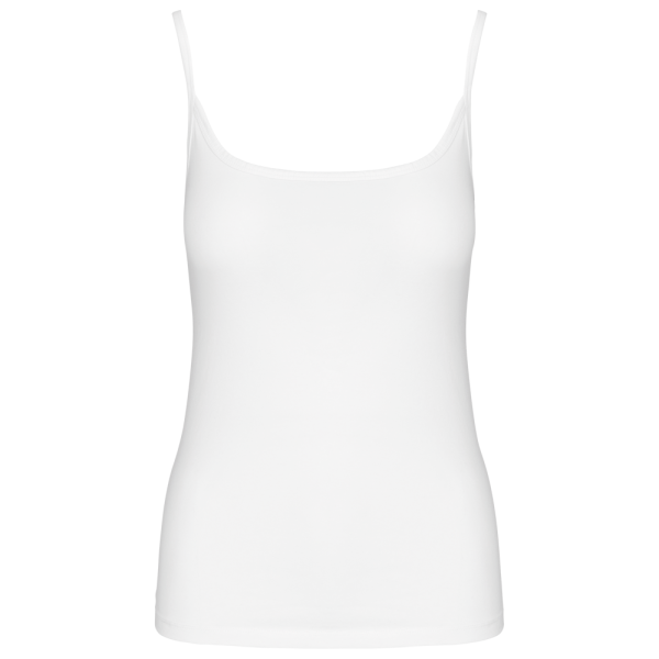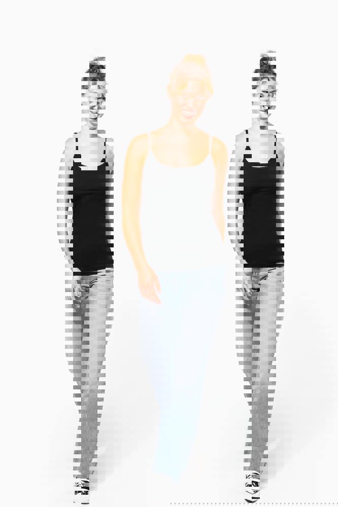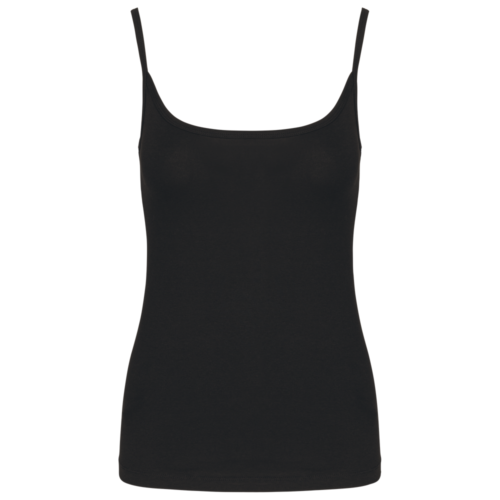 95% katoen / 5% elasthan. (Light Grey Heather : 87% katoen / 9% viscose / 4% elasthan). Gekamt katoen jersey. Dunne schouderbandjes en vrouwelijke pasvorm. Dun biesje aan de kraag en dubbel stiksel onderaan.