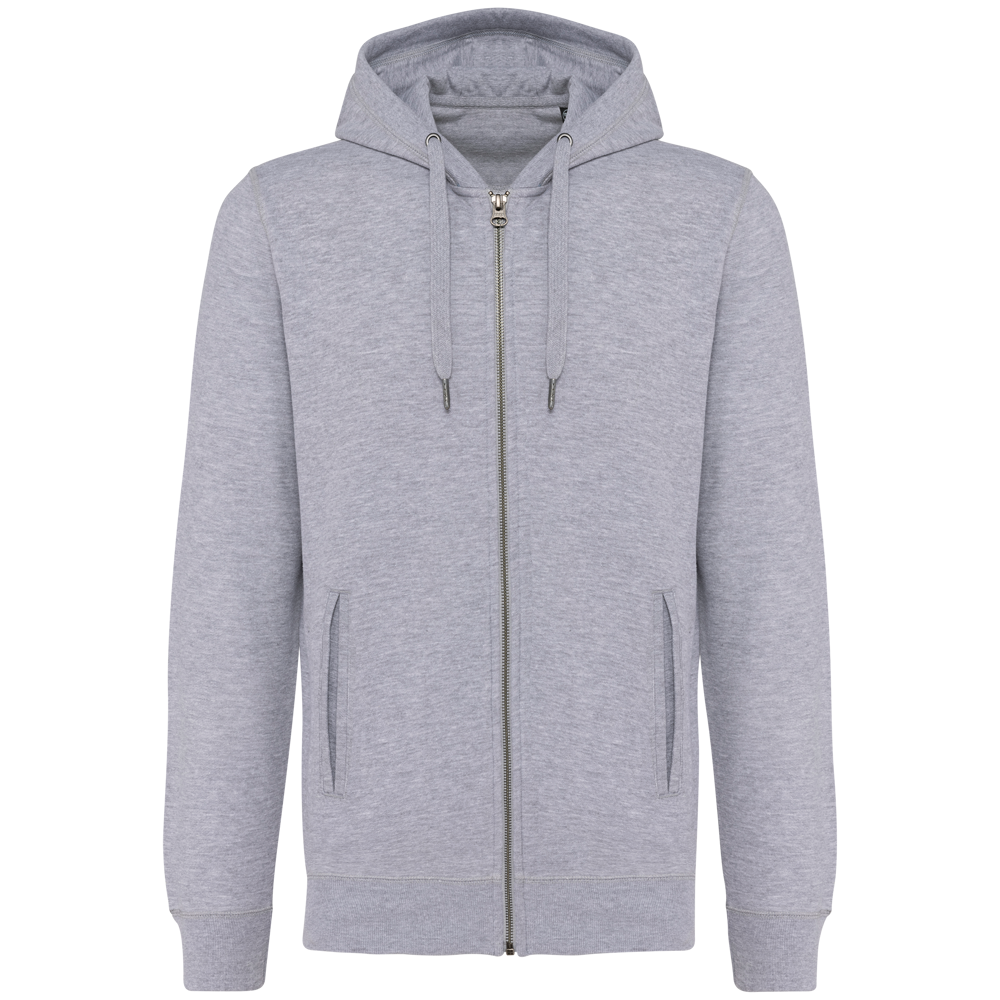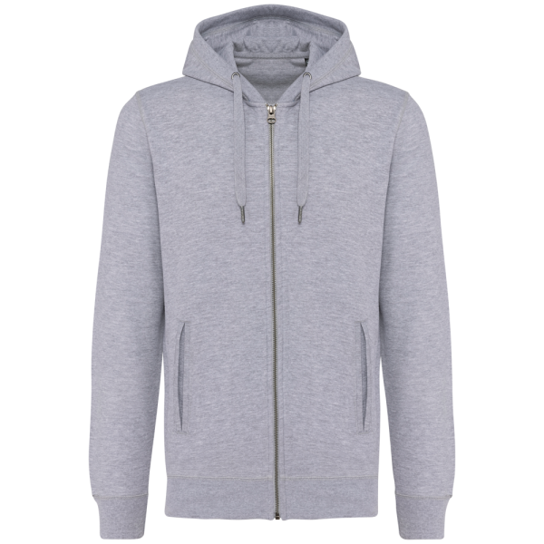 80% biologisch katoen / 20% gerecycleerd polyester post-consumer. Oxford Grey 75% biologisch katoen / 25% gerecycleerd polyester post-consumer. Fleece french terry LST (Low Shrinkage Terry). Stof: enzymgewassen. Rechte snit. 2 omzoomde zakken aan de voorkant. Metalen ritssluiting. Ribboord aan mouwuiteinden, onderkant en de rand van de gevoerde capuchon, met toon-op-toon aanrijgkoordjes met metalen uiteinde. Halvemaanvormige halsopening op de achterkant, voor eenvoudige personalisatie van het merk aan de binnenkant. Nektape in visgraatmotief aan de binnenkant van de kraag. Geen merklabel in de kraag, maar enkel een maatlabel voor eenvoudige personalisatie.