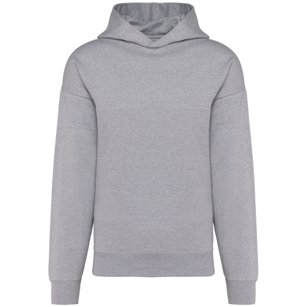 80% katoen / 20% polyester. Oversized model met afhangende schouders. Geborsteld fleece aan de binnenkant. Gekaard katoen. 2x1 ribboord in buisconstructie voor een betere afwerking aan de mouwuiteinden en de onderkant. Verborgen zak met blinde rits in de zijnaad rechts (wanneer gedragen). Gevoerde katoenen capuchon met plooi. In de ribboord aan de mouwuiteinden en onderaan zit elasthaan om vervorming van het kledingstuk te voorkomen. Toon-op-toon nektape met visgraatmotief. Halvemaan in de kraag. Dubbel stiksel aan weerszijden, op de mouwuiteinden en onderaan. Geen merklabel, maar een maatlabel in de kraag voor eenvoudige personalisatie.