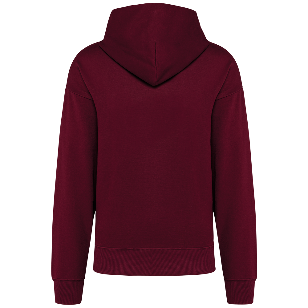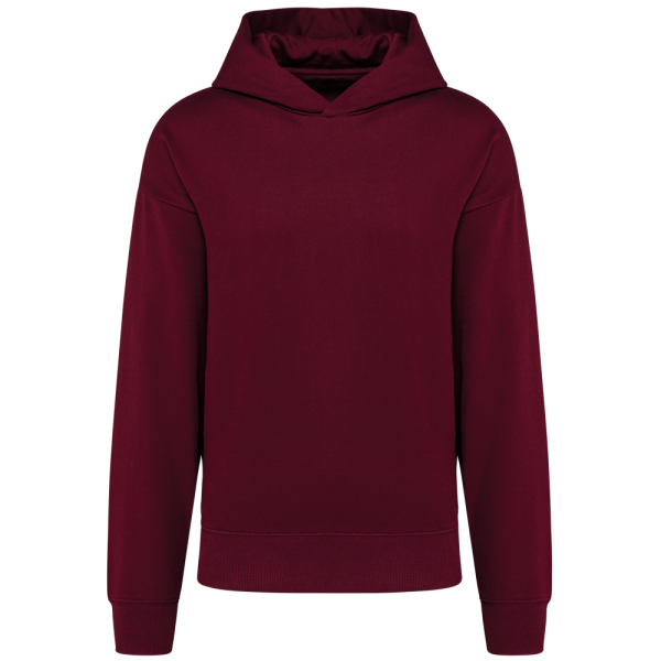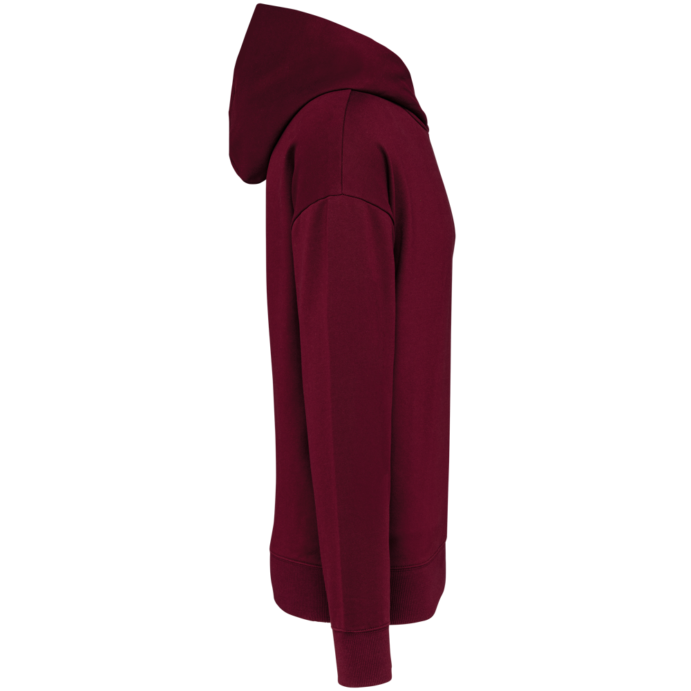 80% katoen / 20% polyester. Oversized model met afhangende schouders. Geborsteld fleece aan de binnenkant. Gekaard katoen. 2x1 ribboord in buisconstructie voor een betere afwerking aan de mouwuiteinden en de onderkant. Verborgen zak met blinde rits in de zijnaad rechts (wanneer gedragen). Gevoerde katoenen capuchon met plooi. In de ribboord aan de mouwuiteinden en onderaan zit elasthaan om vervorming van het kledingstuk te voorkomen. Toon-op-toon nektape met visgraatmotief. Halvemaan in de kraag. Dubbel stiksel aan weerszijden, op de mouwuiteinden en onderaan. Geen merklabel, maar een maatlabel in de kraag voor eenvoudige personalisatie.