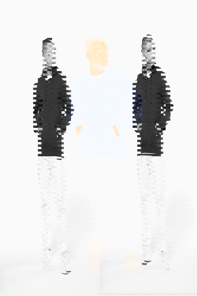 85% katoen / 15% polyester. Gemaakt van 85% biologisch katoen en 15% gerecycled polyester. Buitenoppervlak 100% katoen. Geborsteld fleece 3 draden LSF (Low Shrinkage Fleece) aan de binnenkant. Gekamd katoen. Enzymgewassen. Rechte snit. Kangoeroezakken. Ritssluiting in toon-op-toon nylon. Gevoerde capuchon 100% katoen, jerseykatoen 180 g. 1x1 ribboord in buisconstructie voor een betere afwerking aan de mouwuiteinden en de onderkant. Nektape in toon-op-toon jersey en halvemaanvormige afwerking aan de binnenkant van de kraag. Afwerking dubbel stiksel aan mouwuiteindenn, onderkant en hals. Geen merklabel in de kraag, maar enkel een maatlabel voor eenvoudige personalisatie.