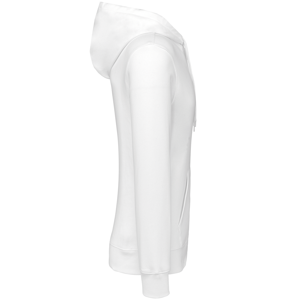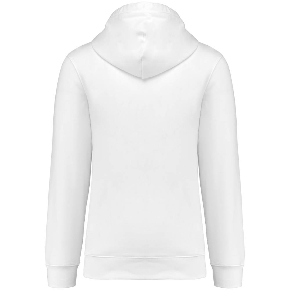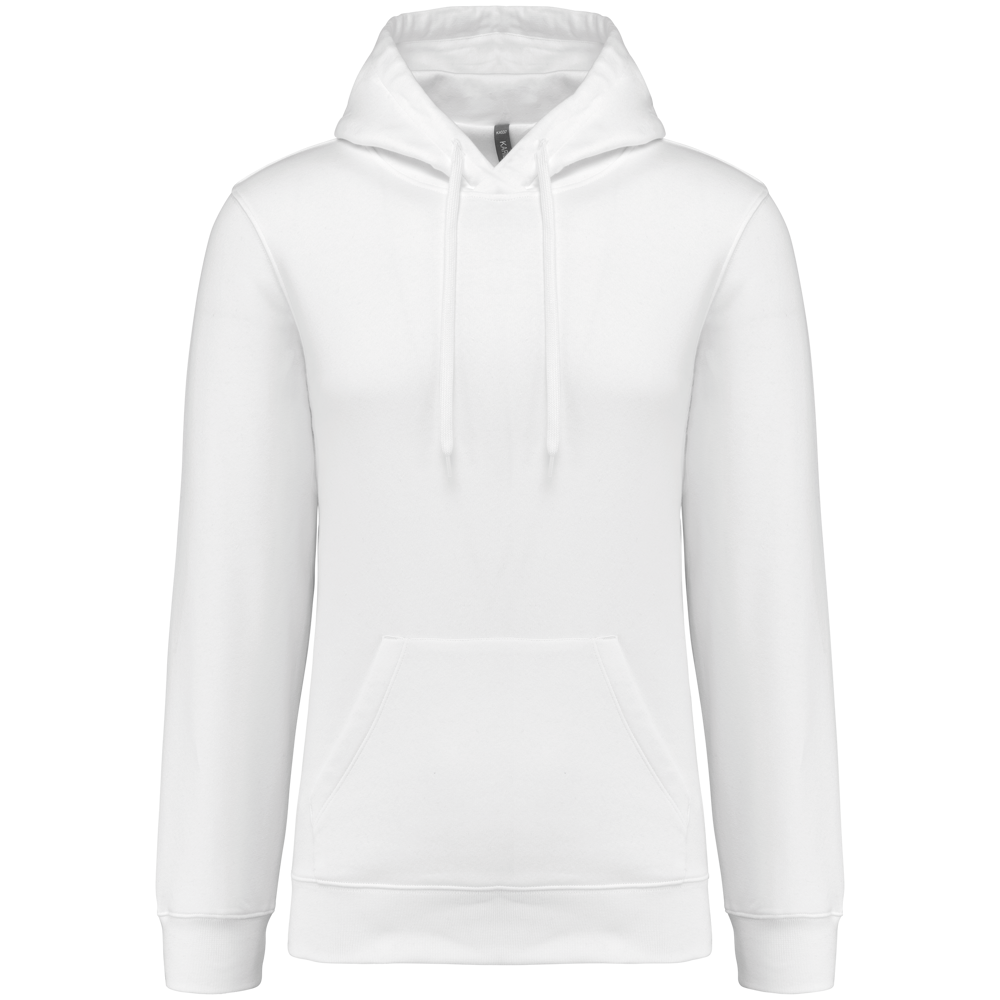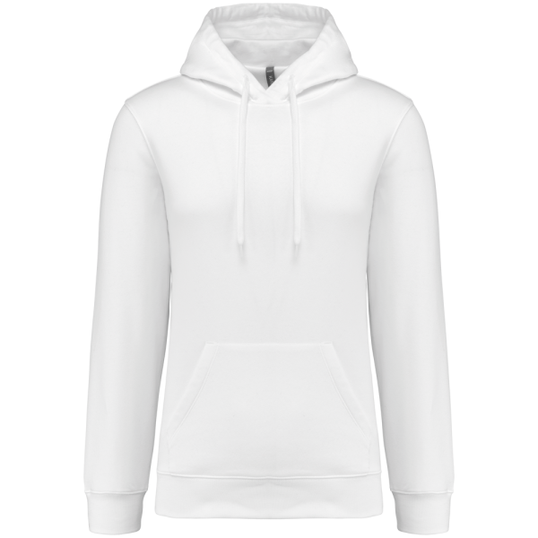 80% katoen / 20% polyester. Geborsteld LSF-fleece 3 draden (Low Shrinkage Fleece), behandeld tegen pluizen. Gemaakt in Portugal. Straight snit. Cut-and-sew-techniek. 1x1 ribboord in buisconstructie voor een betere afwerking aan de mouwuiteinden en de onderkant. Kangoeroezak. Gevoerde capuchon in 100% jerseykatoen met platte aanrijgkoordjes die door knoopsgaten lopen. Halvemaanvormige afwerking aan de binnenkant van de kraag. Dubbel stiksel aan de mouwuiteinden en de onderkant. Geen merklabel, maar een maatlabel in de kraag voor eenvoudige personalisatie.