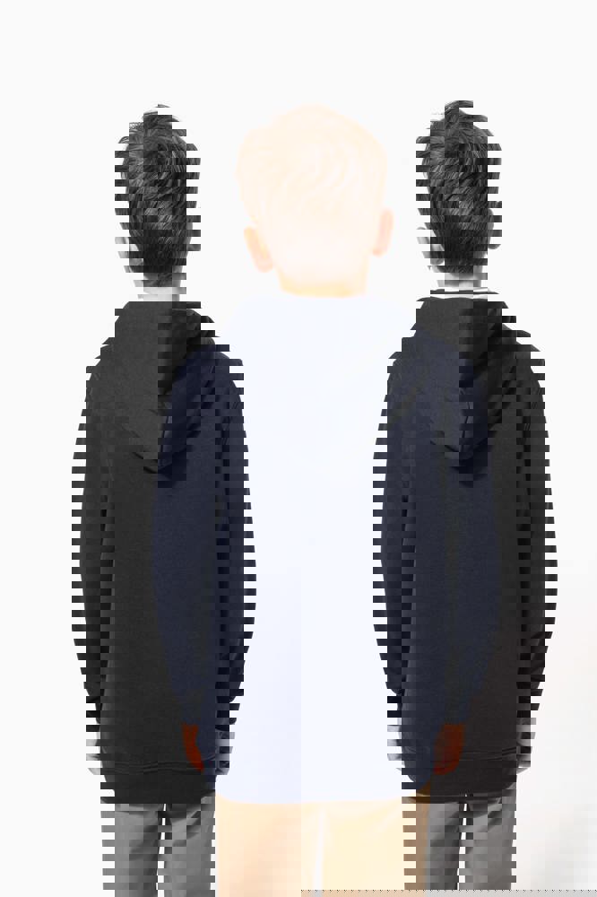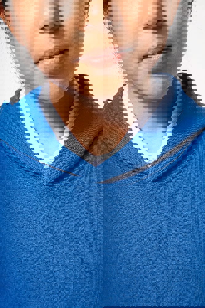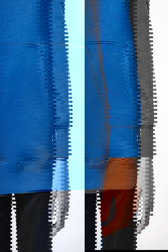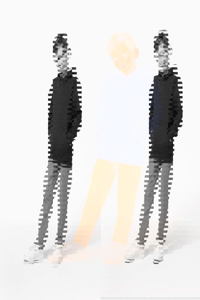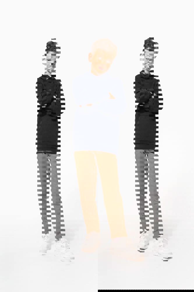 80% katoen / 20% polyester. Gekamd katoen. 3-laags LSF (Low Shrinkage Fleece) geborsteld fleece met behandeling tegen pluizen. Gemaakt in Portugal. Rechte snit. 1x1 ribboord aan de mouwuiteinden en de boord onderaan. Capuchon gevoerd met jerseykatoen. Dubbel stiksel op schouders, armsgaten, mouwuiteinden en boord. Nektape in bijpassende jersey in de kraag. Kangoeroezak. Halvemaanvormig inzetsel achteraan. Naamlabel in de kleding. Geen merklabel in de halsopening, enkel een maatlabel voor eenvoudige personalisatie.