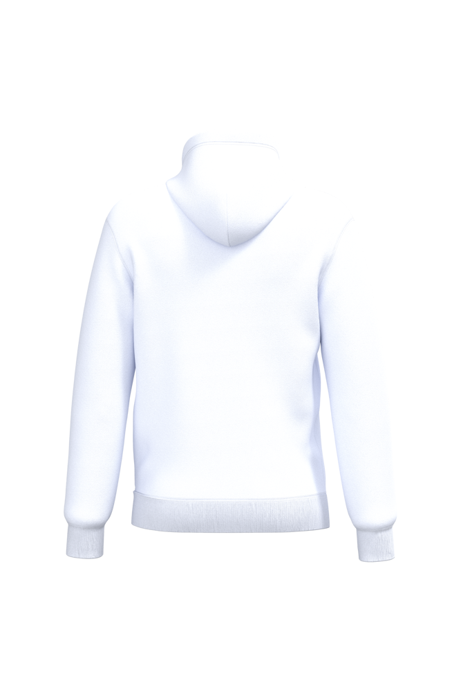 50% ringgesponnen katoen / 50% gerecycled polyester post-consumer. Geborsteld fleece aan de binnenkant. Straight snit. Cut-and-sew-techniek. 2x1 ribboord in buisconstructie voor een betere afwerking aan de hals, de mouwuiteinden en de onderkant. Kangoeroezak. Gevoerde capuchon in jersey-polykatoen met platte aanrijgkoordjes. Ton-sur-ton nektape in jersey in de kraag. Geen merklabel in de kraag, maar enkel een maatlabel voor eenvoudige personalisatie.
