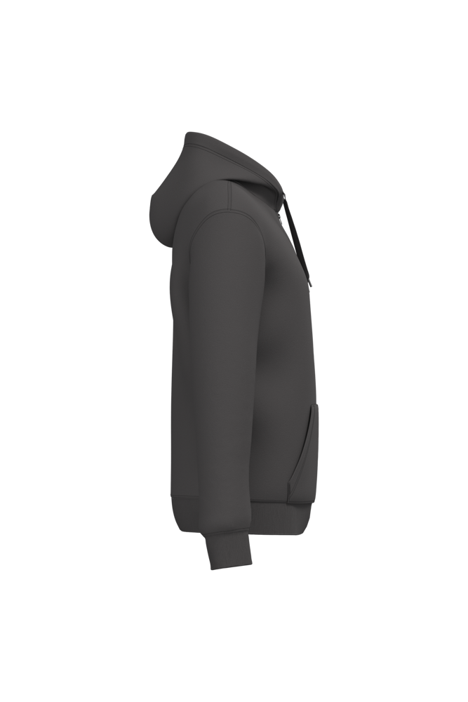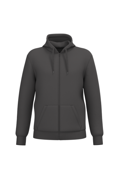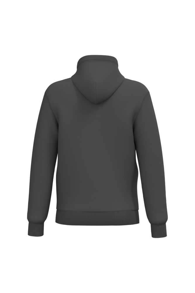 50% ringgesponnen katoen / 50% gerecycled polyester post-consumer. Geborsteld fleece aan de binnenkant. Straight snit. Cut-and-sew-techniek. 2x1 ribboord in buisconstructie voor een betere afwerking aan de hals, de mouwuiteinden en de onderkant. Kangoeroezak. Ritssluiting in nylon. Gevoerde capuchon in jersey-polykatoen met platte aanrijgkoordjes. Toon-op-toon nektape in jersey in de kraag. Geen merklabel in de kraag, maar enkel een maatlabel voor eenvoudige personalisatie.