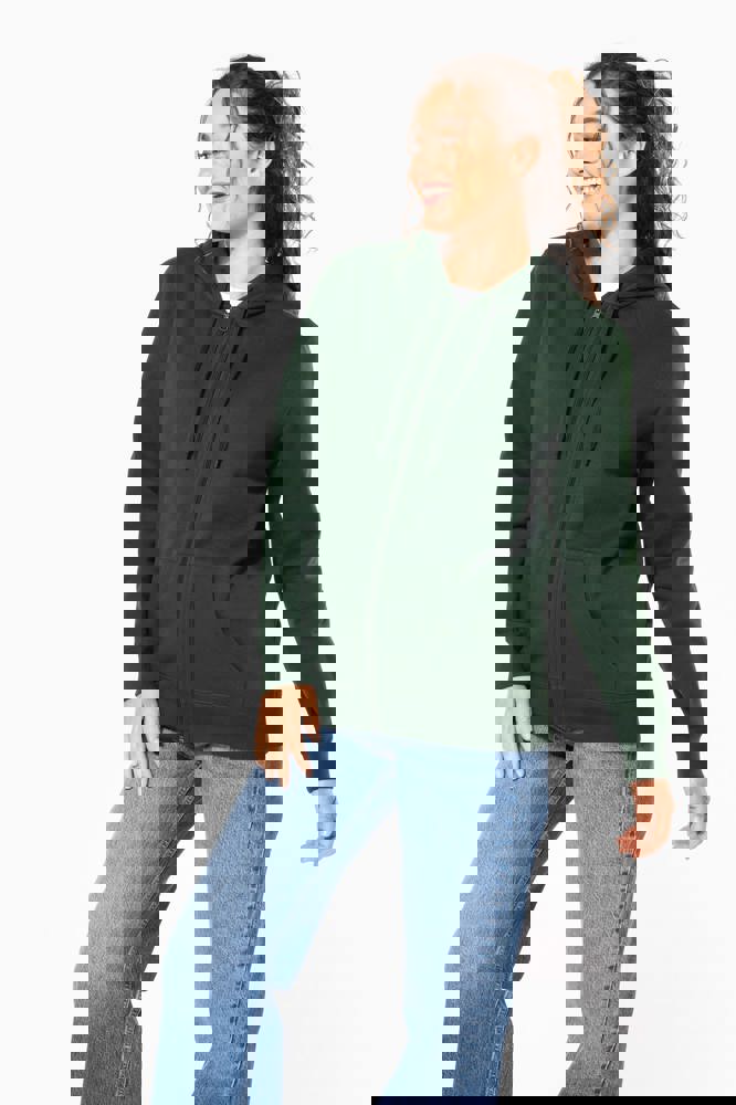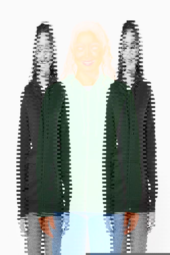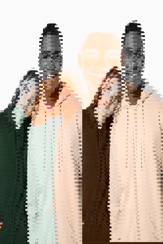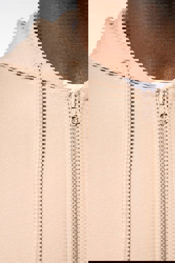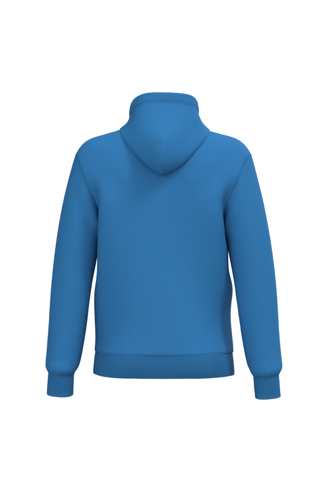 50% ringgesponnen katoen / 50% gerecycled polyester post-consumer. Geborsteld fleece aan de binnenkant. Straight snit. Cut-and-sew-techniek. 2x1 ribboord in buisconstructie voor een betere afwerking aan de hals, de mouwuiteinden en de onderkant. Kangoeroezak. Ritssluiting in nylon. Gevoerde capuchon in jersey-polykatoen met platte aanrijgkoordjes. Toon-op-toon nektape in jersey in de kraag. Geen merklabel in de kraag, maar enkel een maatlabel voor eenvoudige personalisatie.
