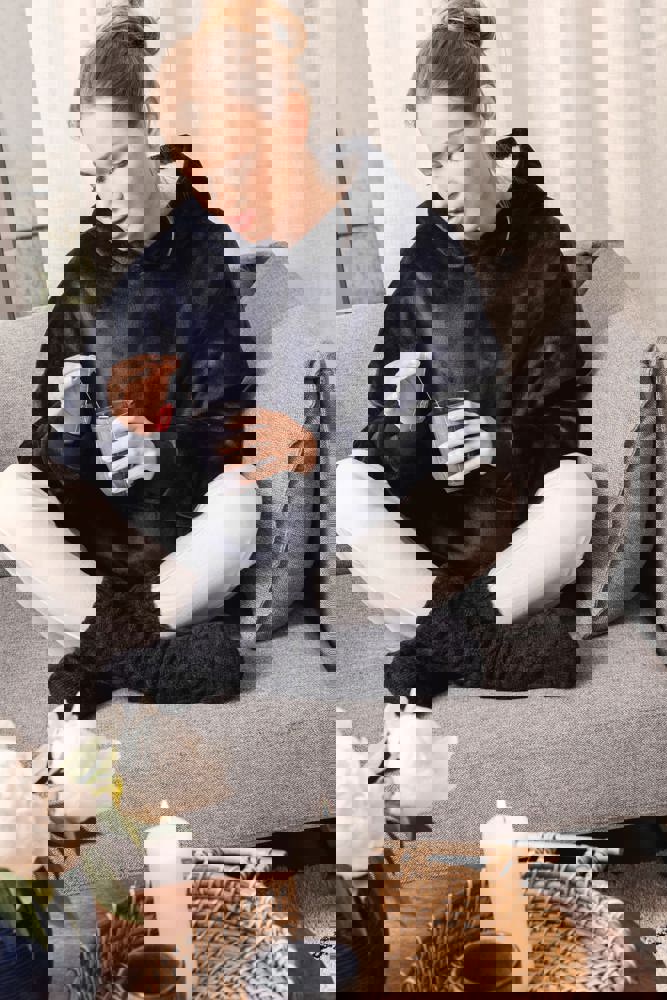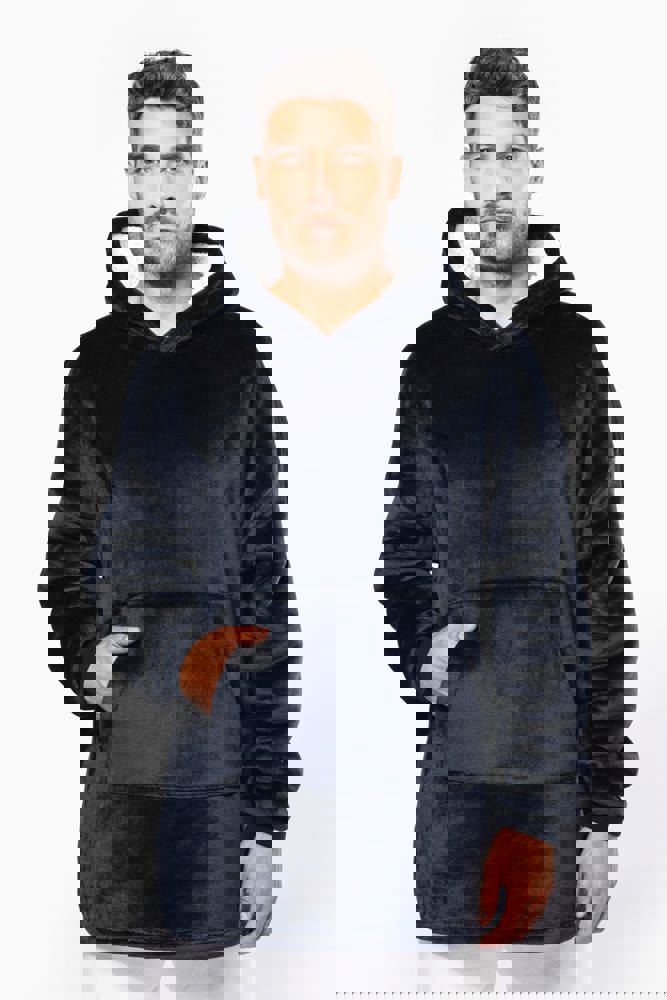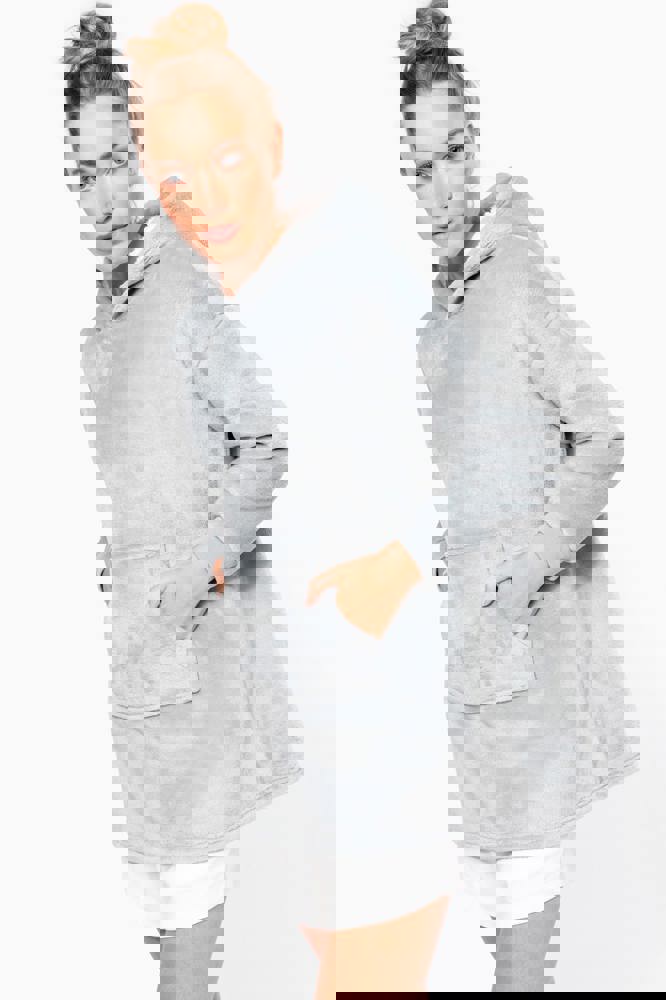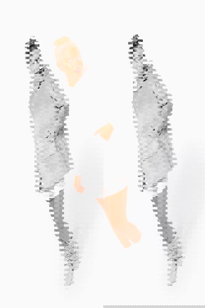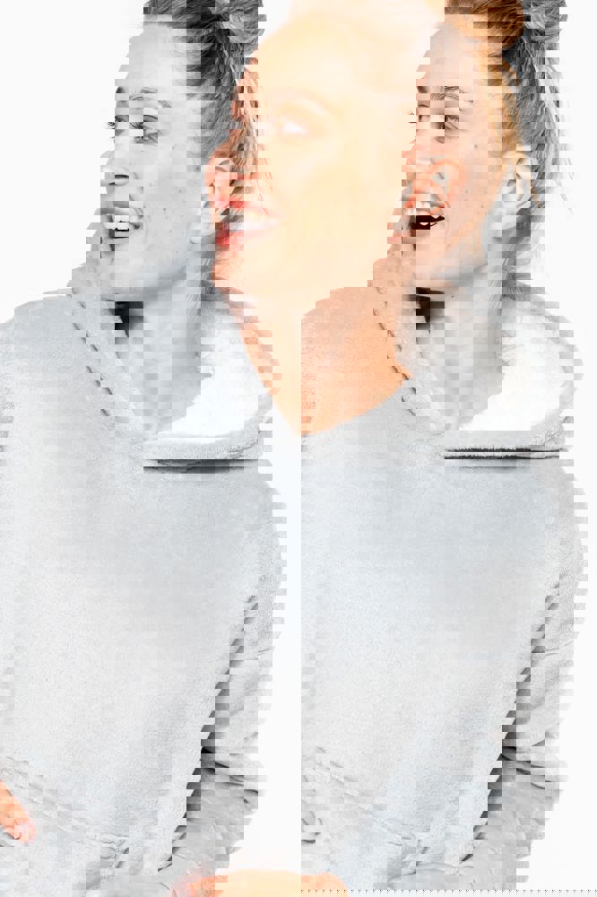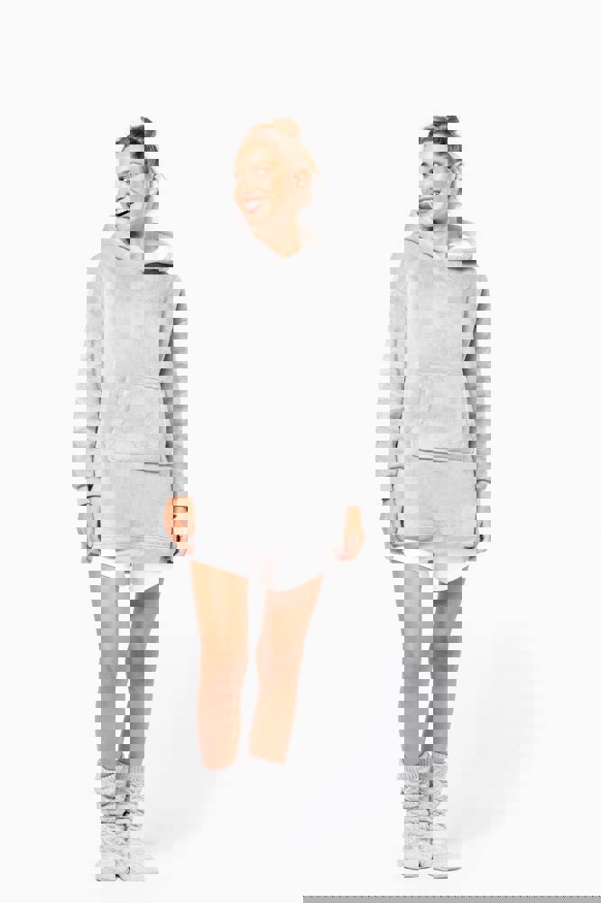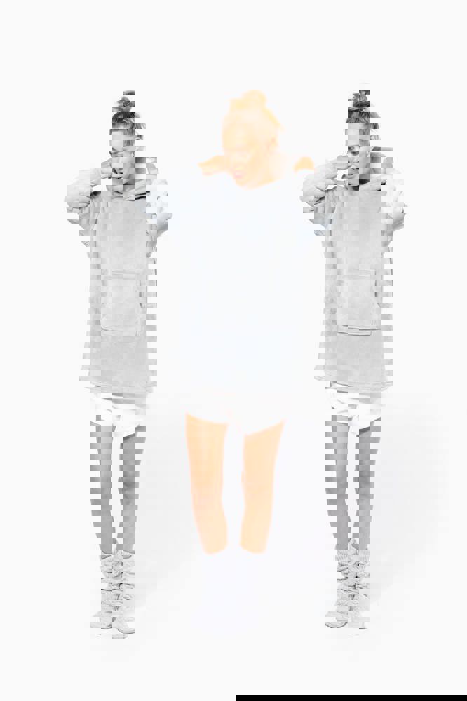 100% polyester. Oversized model met afhangende schouders. Dubbelzijdige stof, buitenzijde van ribfluweel en binnenzijde van sherpa. Vooraan gekruiste capuchon in twee panelen, afgewerkt met dubbel stiksel. Lange mouwen met een mouwuiteinde in 1x1 ribboord. In de ribboord aan de mouwuiteinden zit elasthan om vervorming te voorkomen. Kangoeroezak. De boord onderaan kreeg een dubbel stiksel. Geen merklabel, maar een maatlabel in de kraag voor eenvoudige personalisatie.