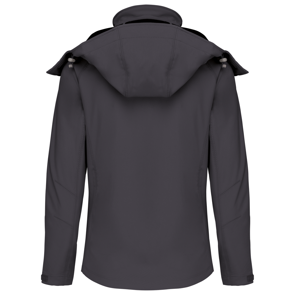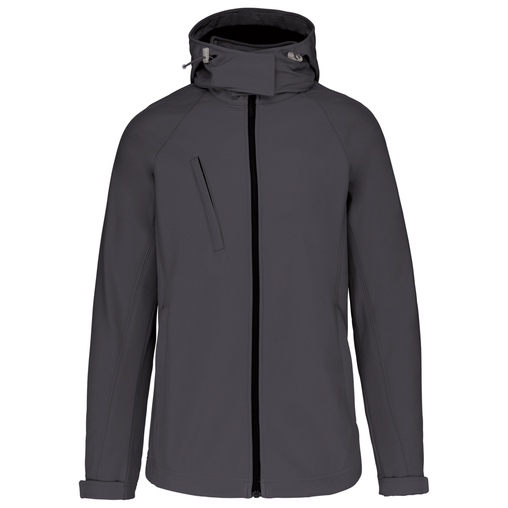 Stof in 3 lagen op elkaar geklit. Ademend 1000 g/m²/24h en 5000 mm waterdicht. Buitenkant : 95% polyester en 5% elasthan. Tussenlaag: ademend ventilerend membraan. Binnenkant: anti-pluis polyester. Raglan mouwen. Ritssluiting. 2 voorzakken met rits. 1 borstzak rechts met rits. Afneembare capuchon met aanrijgkoord en klittenbandsluiting. Klittenbandsluiting aan de mouwuiteinden. Verborgen drukkersrits op borsthoogte.