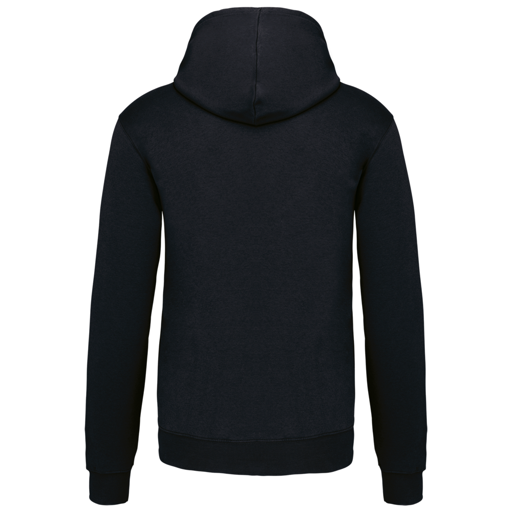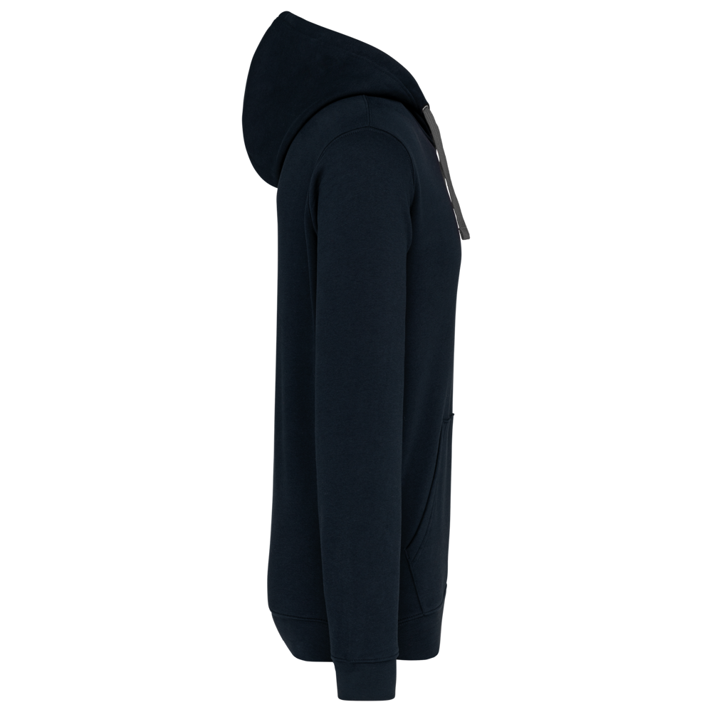 80% katoen / 20% polyester. Gekamd katoen. Geborsteld fleece aan de binnenkant. 'Kangaroe' zak aan de voorkant met gaatje voor draadje en lusje aan de kraag voor mp3-oortjes. Afwerking in ribboord. Gevoerde en gecontrasteerde capuchon met aanrijgkoordjes.