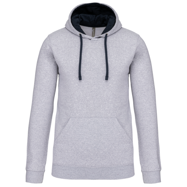 80% katoen / 20% polyester. Gekamd katoen. Geborsteld fleece aan de binnenkant. 'Kangaroe' zak aan de voorkant met gaatje voor draadje en lusje aan de kraag voor mp3-oortjes. Afwerking in ribboord. Gevoerde en gecontrasteerde capuchon met aanrijgkoordjes.