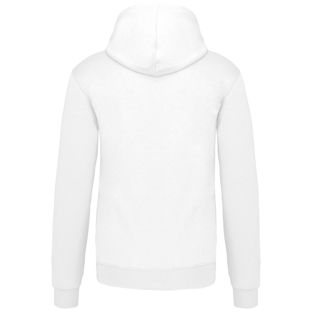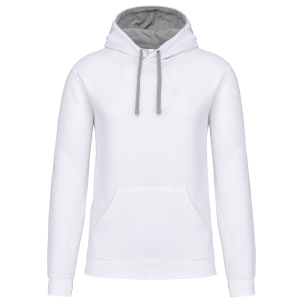 80% katoen / 20% polyester. Gekamd katoen. Geborsteld fleece aan de binnenkant. 'Kangaroe' zak aan de voorkant met gaatje voor draadje en lusje aan de kraag voor mp3-oortjes. Afwerking in ribboord. Gevoerde en gecontrasteerde capuchon met aanrijgkoordjes.
