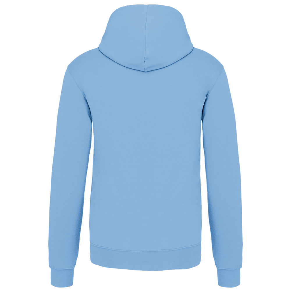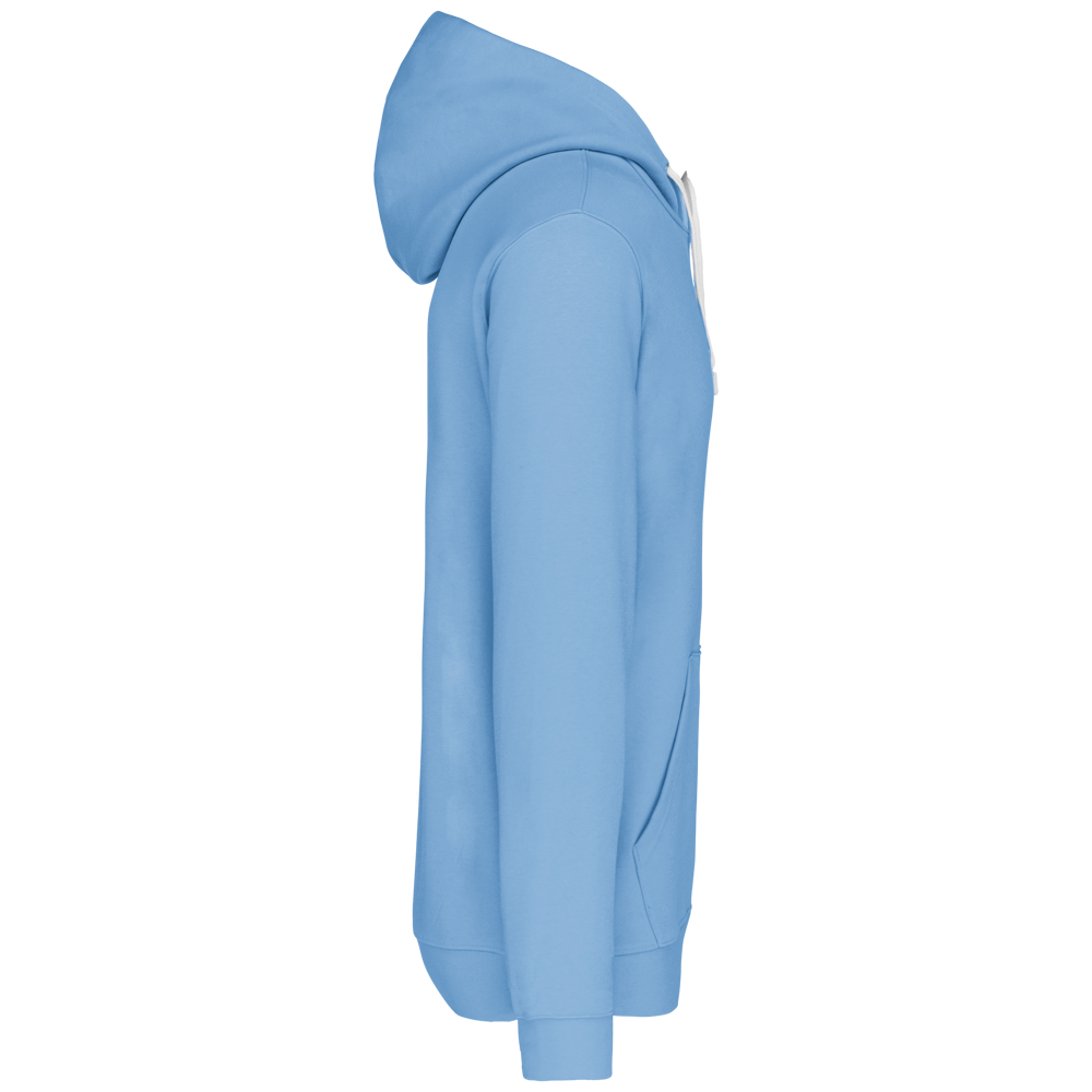 80% katoen / 20% polyester. Gekamd katoen. Geborsteld fleece aan de binnenkant. 'Kangaroe' zak aan de voorkant met gaatje voor draadje en lusje aan de kraag voor mp3-oortjes. Afwerking in ribboord. Gevoerde en gecontrasteerde capuchon met aanrijgkoordjes.