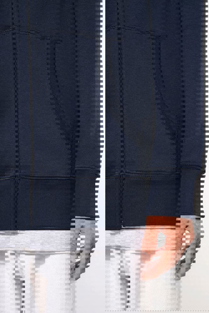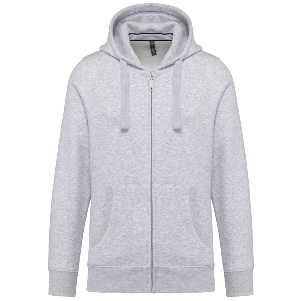 80% katoen / 20% polyester (Ash Heather: 79% katoen / 20% polyester / 1% viscose). Buitenoppervlak 100% gekamd katoen. Geborsteld fleece aan de binnenkant. Nektape in contrastkleur. (Navy voor de kleur Oxford Grey en Ash Heather ; Oxford Grey voor alle andere kleuren). Gevoerde capuchon in honinggraatstructuur met aanrijgkoordje. 'Kangaroe' zakken. Afwerking in rib aan de zakken, mouwuiteinden en onderaan. Ritssluiting.