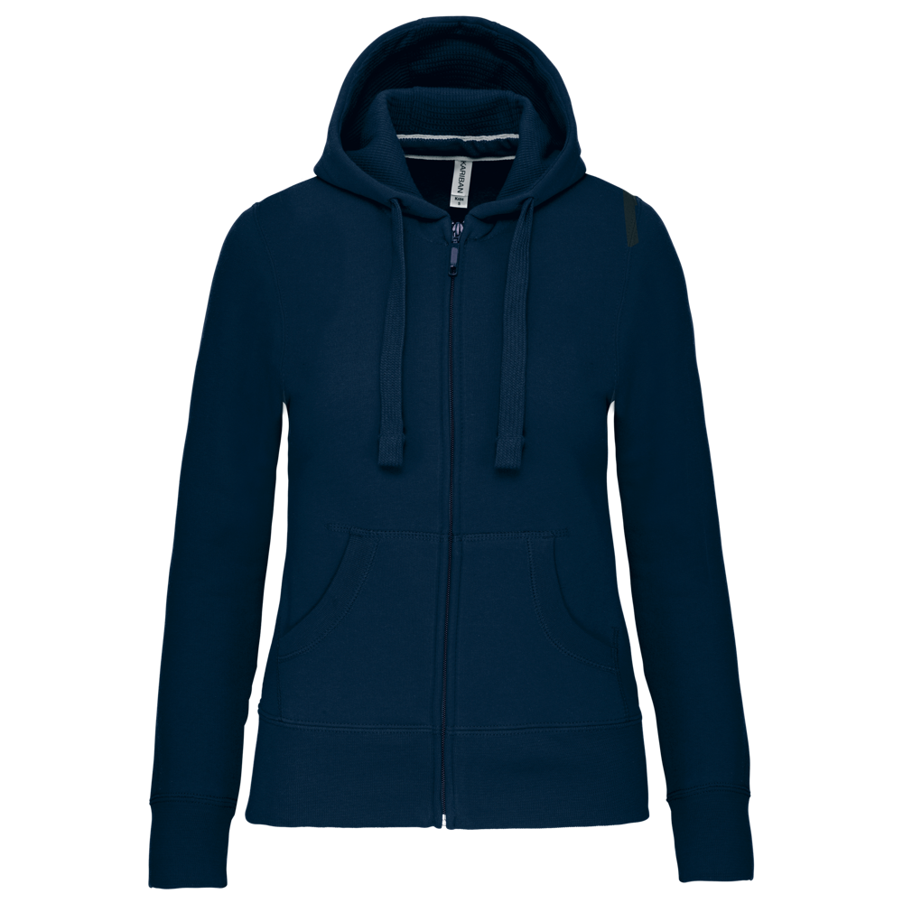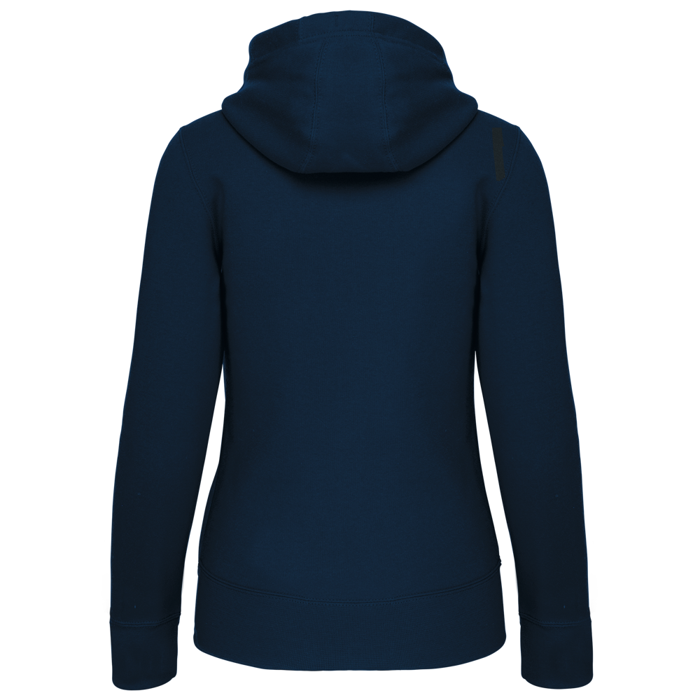 80% katoen / 20% polyester (Ash Heather: 79% katoen / 20% polyester / 1% viscose). Buitenoppervlak 100% gekamd katoen. Geborsteld fleece aan de binnenkant. Nektape in contrasterende kleur aan de halsopening (Navy voor kleur Oxford Grey en Ash Heather ; Oxford Grey voor alle andere kleuren). Gevoerde capuchon in honinggraatstructuur. Kangoeroezakken. Ribboord aan mouwuiteinden en onderkant kledingstuk. Ritssluiting.