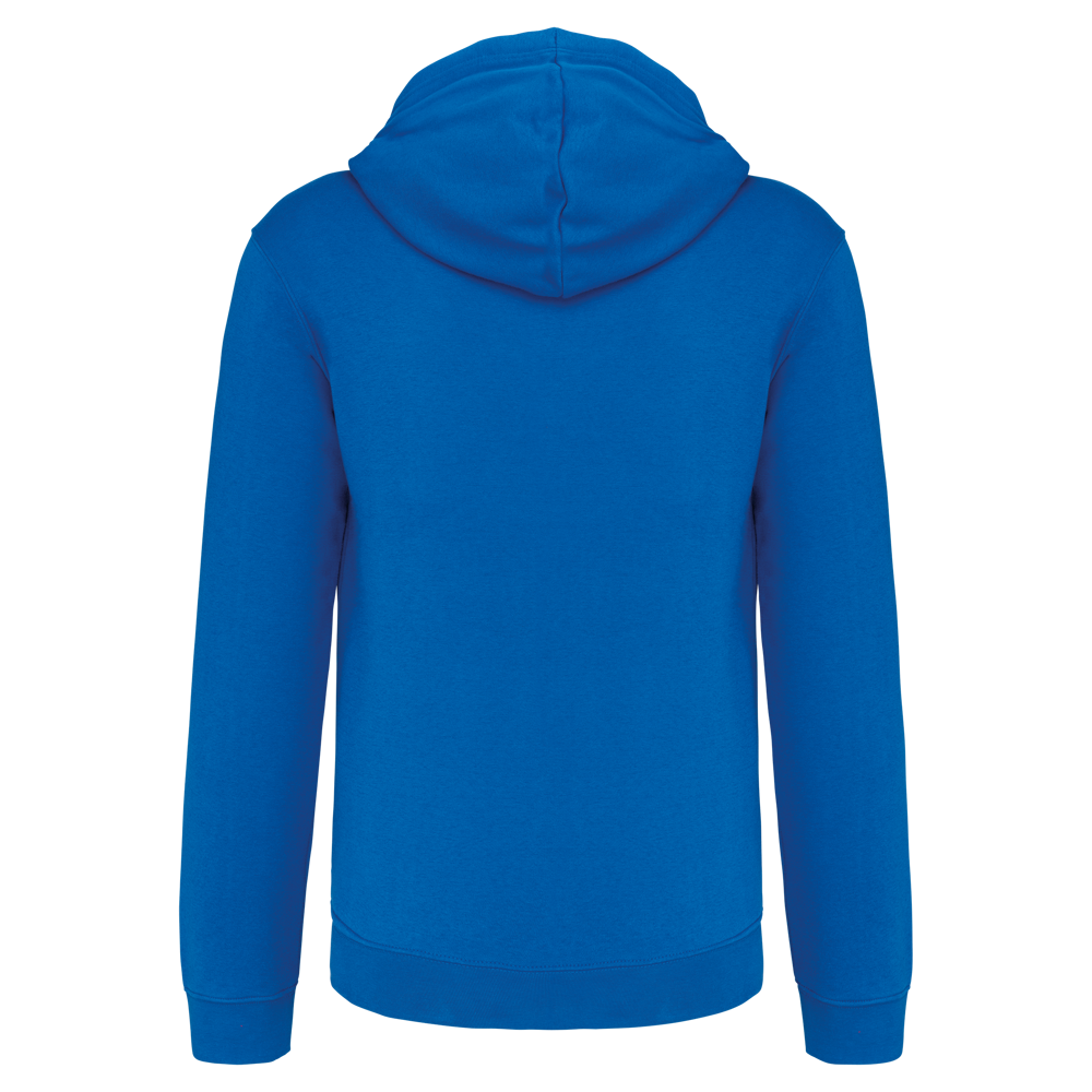 80% katoen / 20% polyester. Gekamd katoen. Geborsteld fleece aan de binnenkant. Gaatje voor draadje in de kangoeroezak en lusje aan de kraag voor oortjes. Ribboord aan mouwuiteinden en onderkant kledingstuk. Gevoerde capuchon in contrasterende kleur met aanrijgkoordjes. Rits in contrasterende kleur.