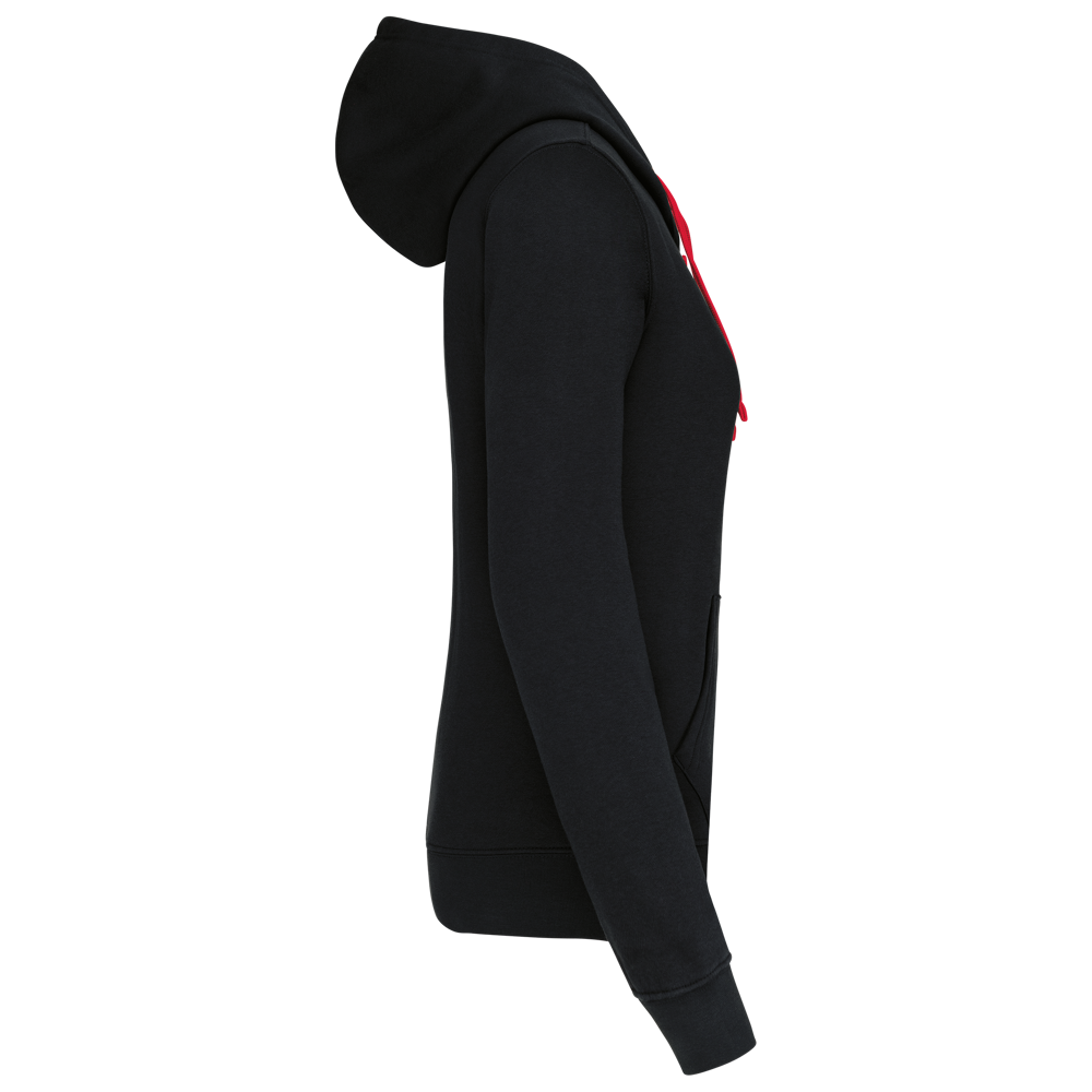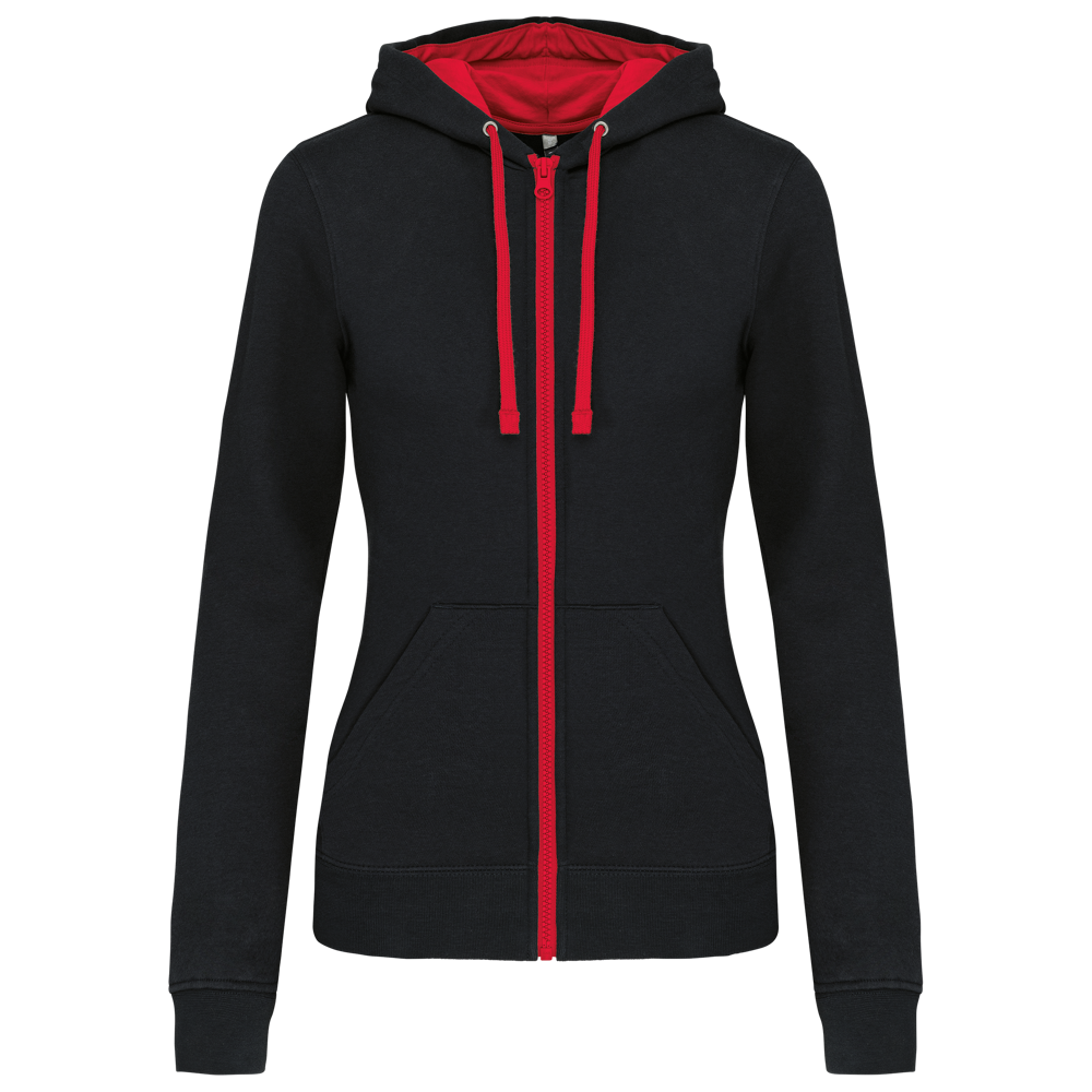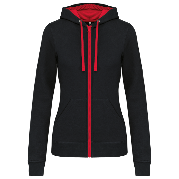 K467 - Damessweater met rits en capuchon in contrasterende kleur