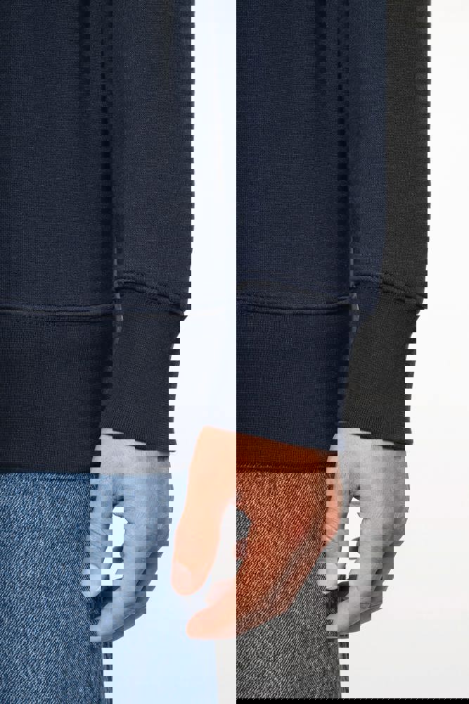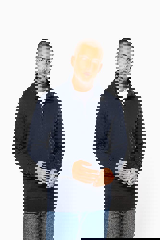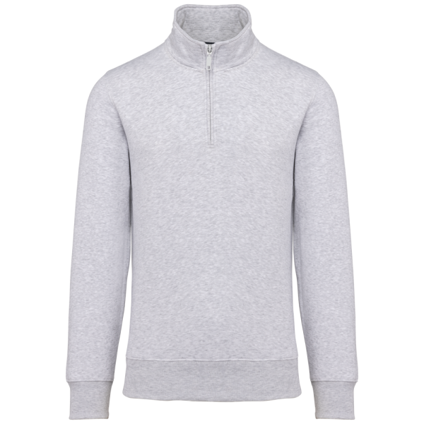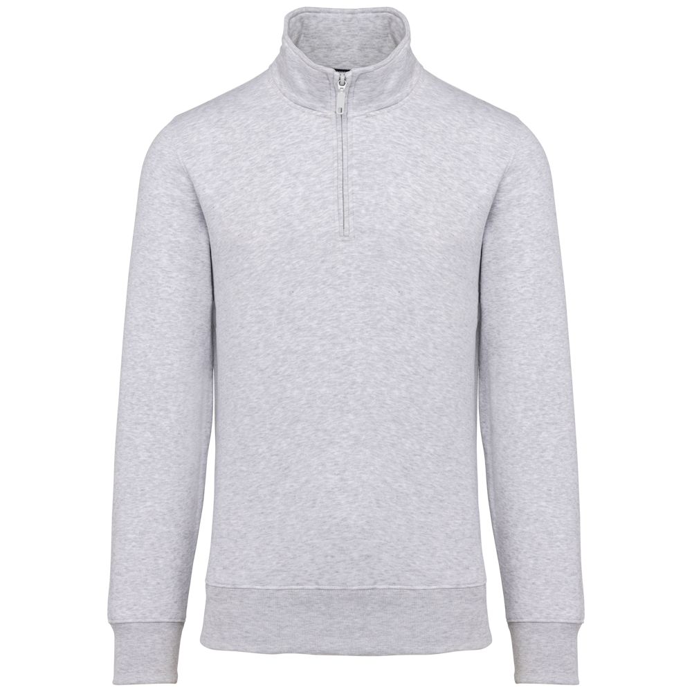 80% katoen / 20% polyester (Ash Heather : 79% katoen / 20% polyester / 1% viscose). Buitenoppervlak 100% katoen. LSF-behandeling (Low Shrinkage Fleece : voorgekrompen fleece). Aan de binnenkant geborsteld fleece 3 draden van gekamd katoen. Ingezette mouwen. Kraag met toon-op-toon plastic ritssluiting. Nektape in contrasterende kleur aan de halsopening (Navy voor de kleur Oxford Grey en Ash Heather ; Oxford Grey voor alle andere kleuren). Ribboord aan mouwuiteinden en aan de onderkant.