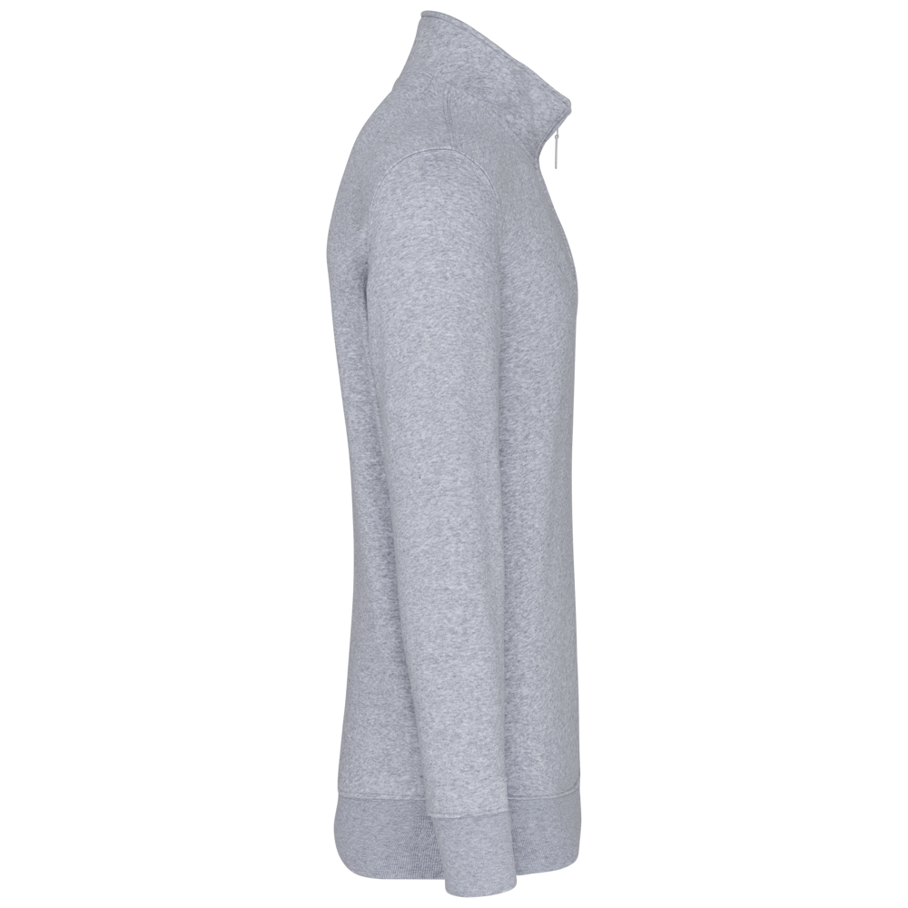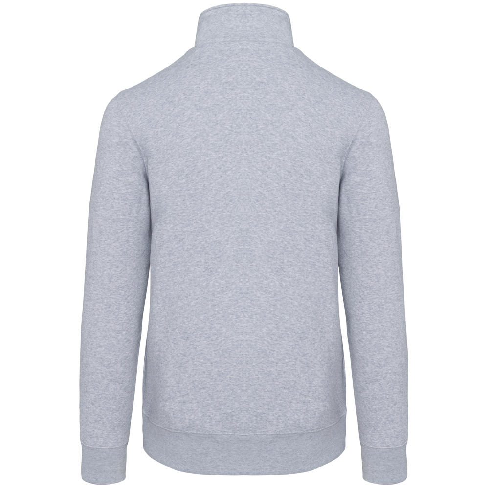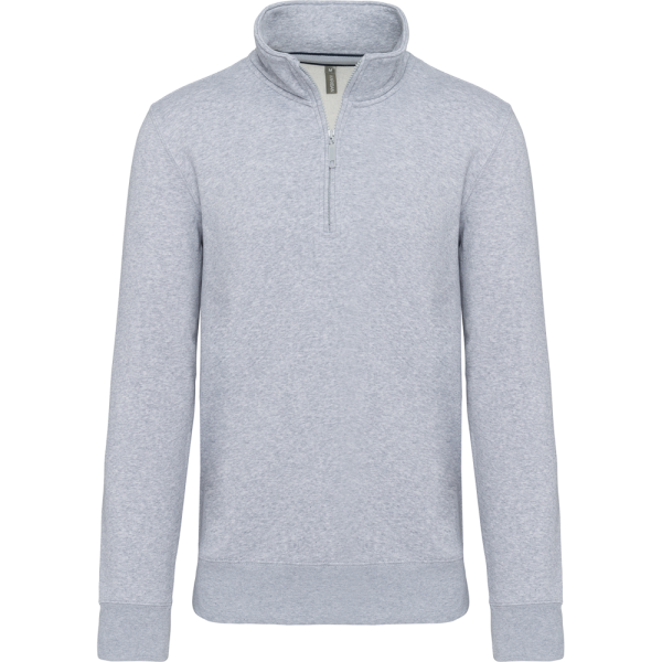 80% katoen / 20% polyester (Ash Heather : 79% katoen / 20% polyester / 1% viscose). Buitenoppervlak 100% katoen. LSF-behandeling (Low Shrinkage Fleece : voorgekrompen fleece). Aan de binnenkant geborsteld fleece 3 draden van gekamd katoen. Ingezette mouwen. Kraag met toon-op-toon plastic ritssluiting. Nektape in contrasterende kleur aan de halsopening (Navy voor de kleur Oxford Grey en Ash Heather ; Oxford Grey voor alle andere kleuren). Ribboord aan mouwuiteinden en aan de onderkant.