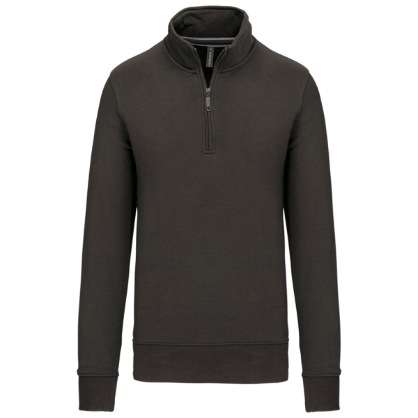 80% katoen / 20% polyester (Ash Heather : 79% katoen / 20% polyester / 1% viscose). Buitenoppervlak 100% katoen. LSF-behandeling (Low Shrinkage Fleece : voorgekrompen fleece). Aan de binnenkant geborsteld fleece 3 draden van gekamd katoen. Ingezette mouwen. Kraag met toon-op-toon plastic ritssluiting. Nektape in contrasterende kleur aan de halsopening (Navy voor de kleur Oxford Grey en Ash Heather ; Oxford Grey voor alle andere kleuren). Ribboord aan mouwuiteinden en aan de onderkant.