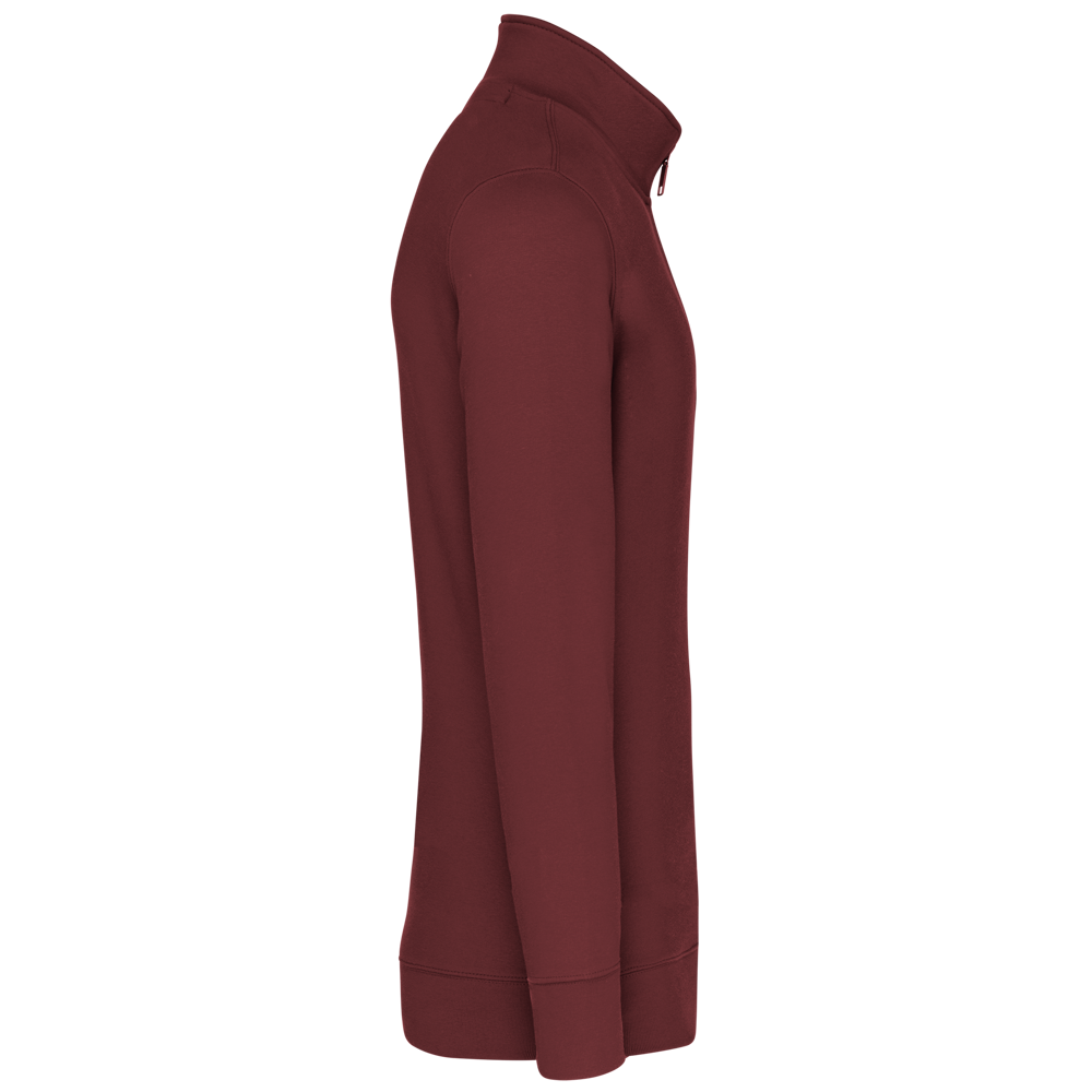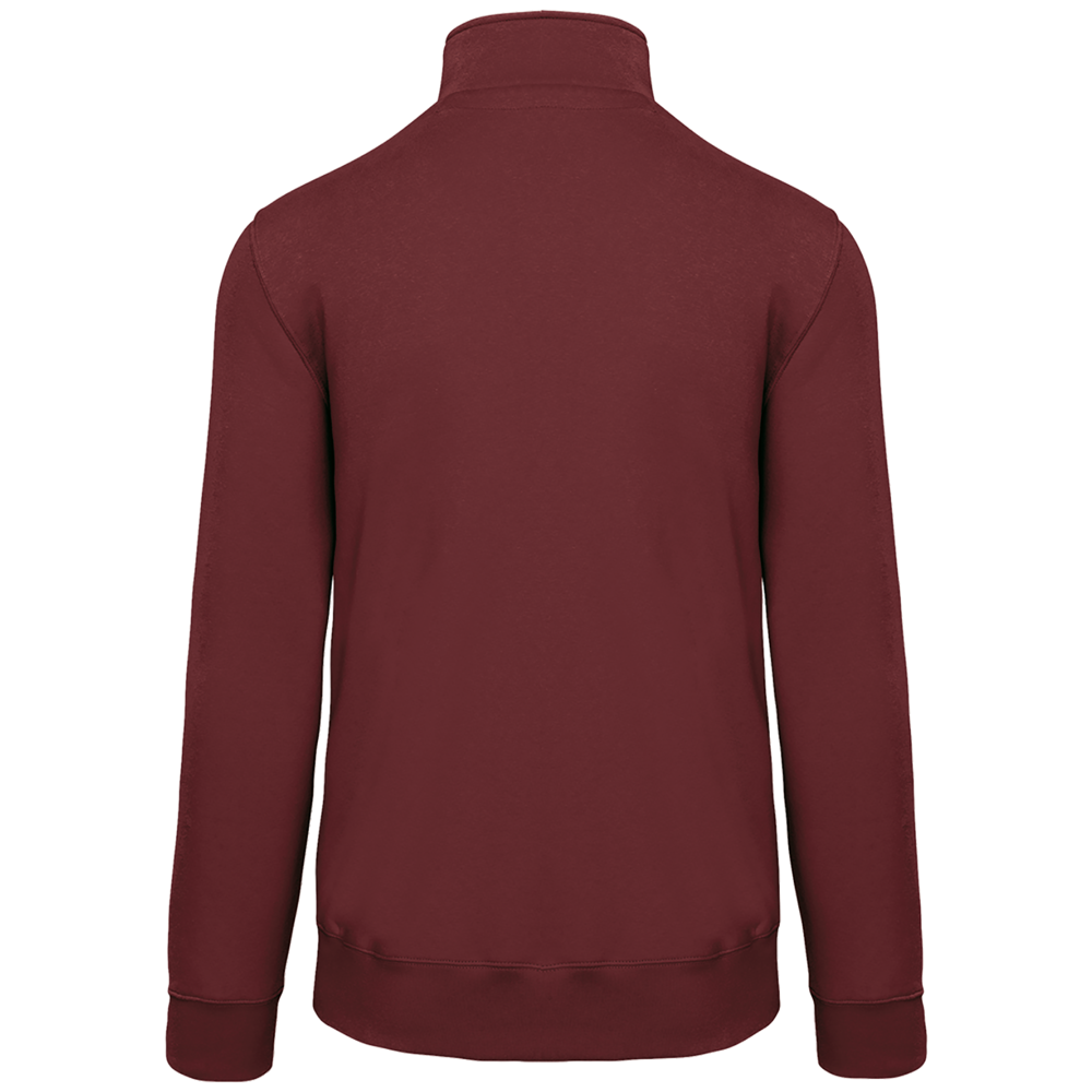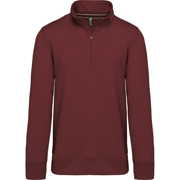 80% katoen / 20% polyester (Ash Heather : 79% katoen / 20% polyester / 1% viscose). Buitenoppervlak 100% katoen. LSF-behandeling (Low Shrinkage Fleece : voorgekrompen fleece). Aan de binnenkant geborsteld fleece 3 draden van gekamd katoen. Ingezette mouwen. Kraag met toon-op-toon plastic ritssluiting. Nektape in contrasterende kleur aan de halsopening (Navy voor de kleur Oxford Grey en Ash Heather ; Oxford Grey voor alle andere kleuren). Ribboord aan mouwuiteinden en aan de onderkant.