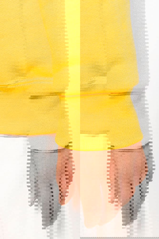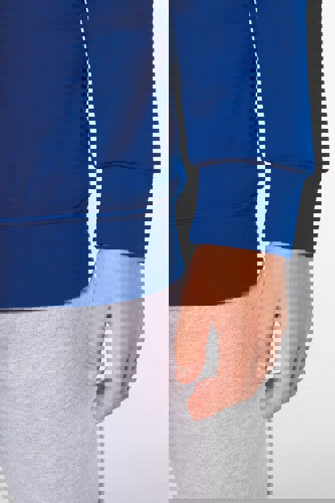 80% katoen / 20% polyester. Gekamd katoen. Geborsteld fleece aan de binnenkant. Ingezette mouwen. Ribboord aan halsopening, mouwuiteinden en aan de onderkant.
