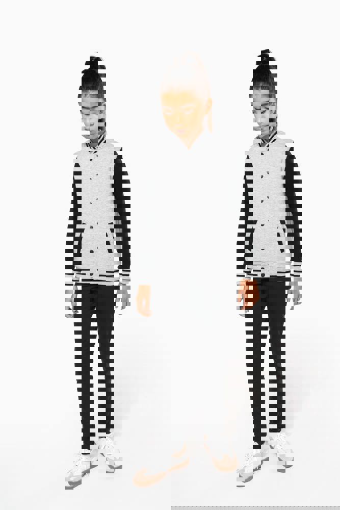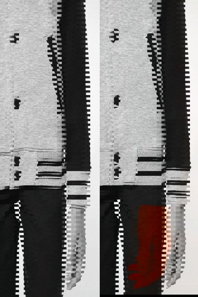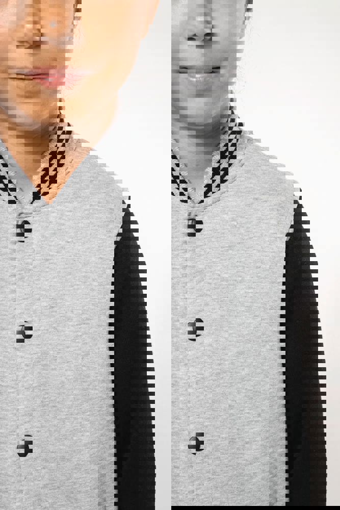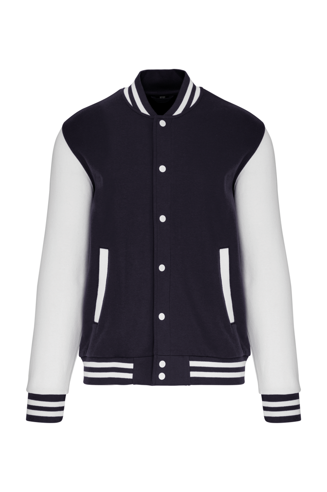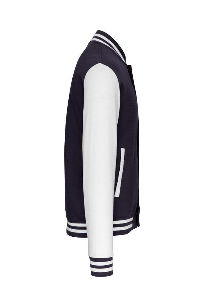 70% katoen / 30% polyester. Geborsteld fleece 3 draden. Contrasterende ingezette mouwen. Sluit aan de voorkant met drukknopen. Ribboord met 2 contrasterende biesjes aan kraag, mouwen en onderkant. 2 omzoomde zakken aan de voorkant. Nektape met visgraatmotief en ophanglus in de kraag. Geen merklabel in de kraag, maar enkel een maatlabel voor eenvoudige personalisatie. Dit mode-icoon is alomtegenwoordig: van de straat tot de schoolbanken en zelfs het podium.