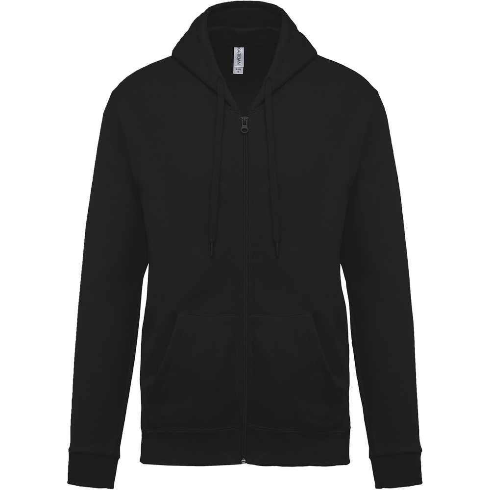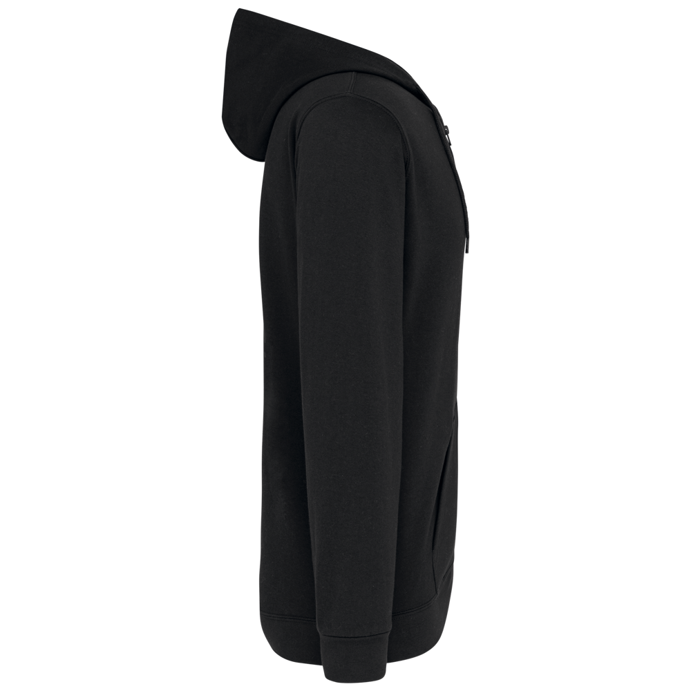 80% katoen / 20% polyester. Gekamd katoen. Geborsteld fleece aan de binnenkant. Ingezette mouwen. Nylon ritssluiting. Gevoerde capuchon met toon op toon aanrijgkoordjes. Kangoeroezakken. Ribboord aan mouwuiteinden en aan de onderkant.